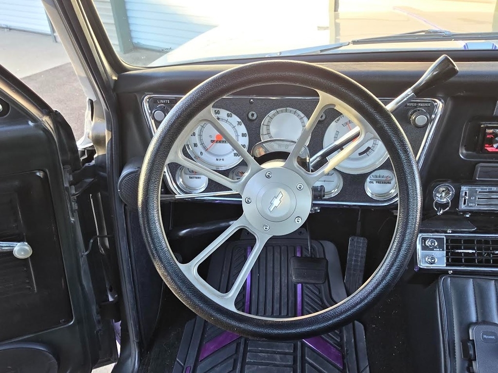 This truck has been thoughtfully updated throughout, starting with a new dash pad and all-new glass. The interior features new pleated vinyl upholstery with integrated cup holders, new leather door panels, a modern hot rod–style steering column, and Classic Instruments gauges that blend vintage style with modern reliability. Entertainment and convenience upgrades include a Bluetooth radio with five speakers and built-in dedicated phone charging ports.