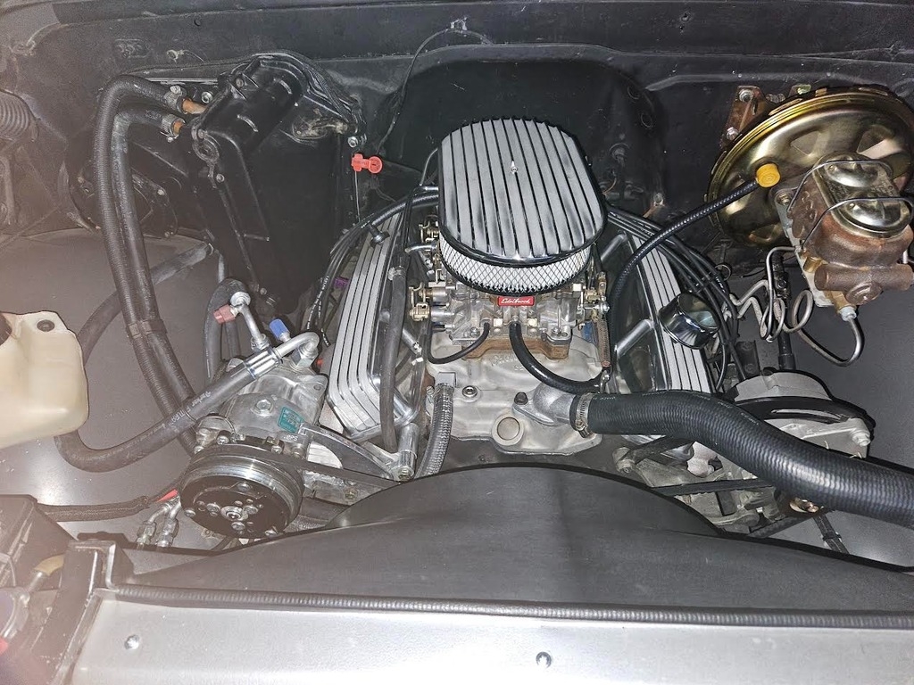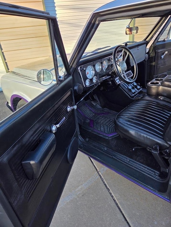 This C10 is powered by a Chevy 350 small block V8 engine paired with a 700R4 4-speed automatic transmission. The engine has 4,696 miles since the rebuild and it is shown with a silver exterior with purple accents and a black leather interior. This vehicle has been non-smoking, garage-kept, and well-maintained.
