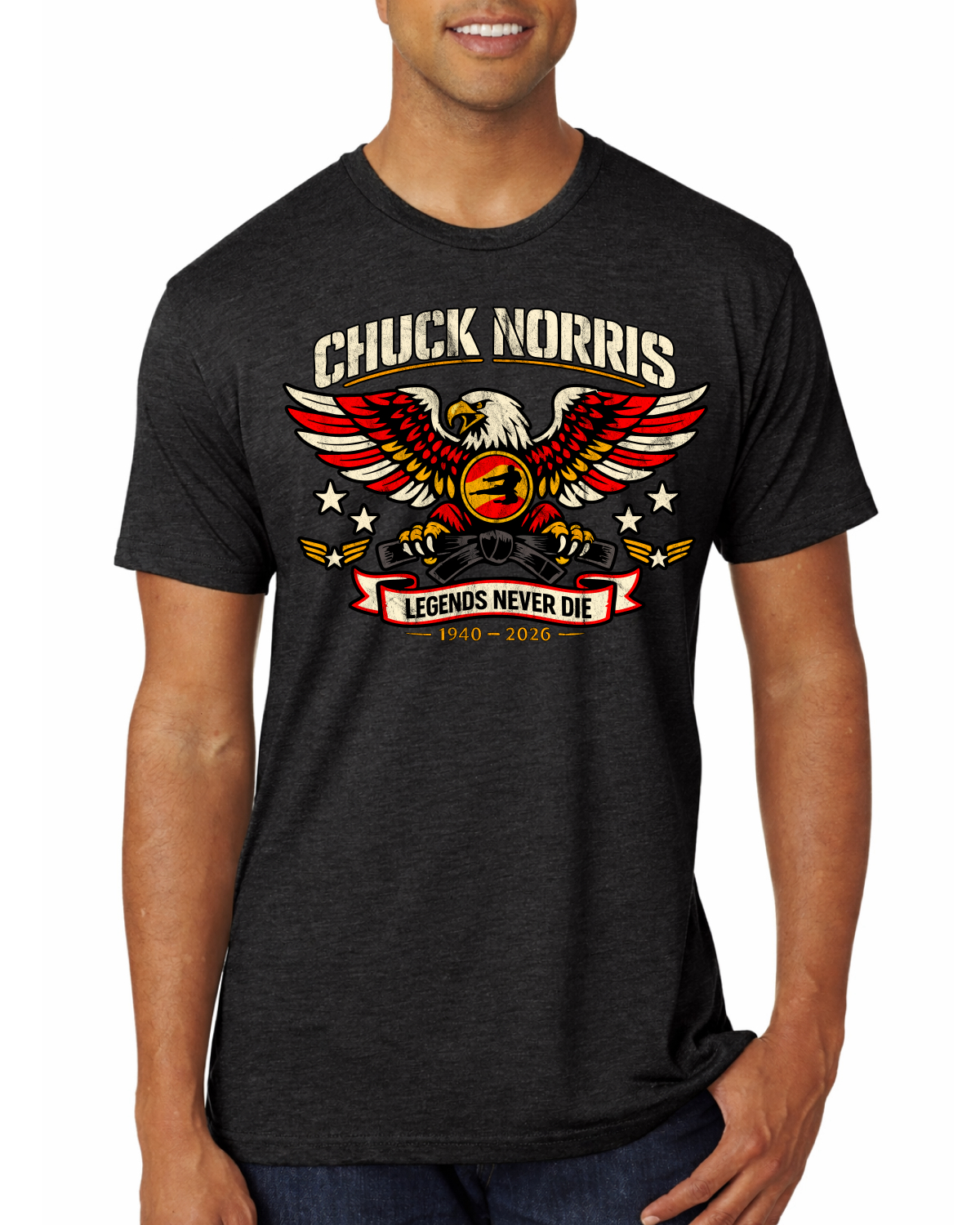 Chuck Norris Legends Never Die 1940-2026 RIP Memorial Bald Eagle Black Belt Tribute Mens Premium Tri Blend T-Shirt