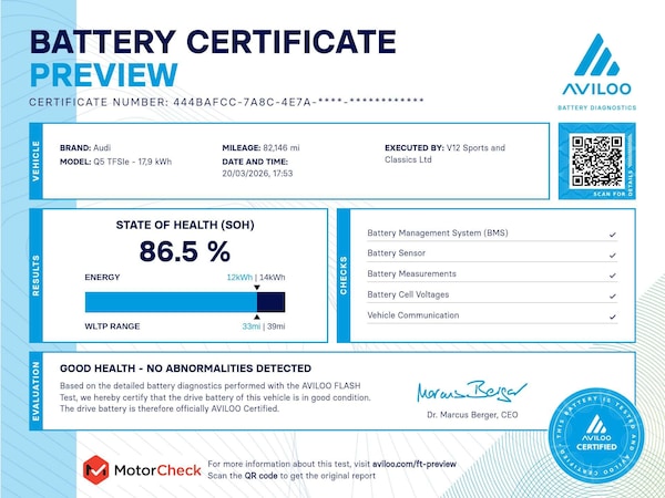 Introducing the Audi Q5 2.0 TFSIe 50 S line Sportback – the epitome of luxury and performance in one sleek package. With a powerful Petrol Plug-in Hybrid engine and cutting-edge S Tronic quattro technology, this Euro 6 compliant vehicle is designed to deliver an exhilarating driving experience like no other. This particular Audi Q5 boasts a stunning Grey finish that exudes sophistication and style. Experience the thrill of 299 PS at your fingertips, combined with the efficiency of a 17.9kWh battery, making every journey a seamless blend of power and eco-friendliness. Whether you're cruising through the city streets or embarking on a long-distance adventure, the Audi Q5 is sure to impress with its dynamic performance and intelligent design. Don't miss out on the opportunity to own a piece of automotive excellence. Visit us today to test drive the Audi Q5 and discover the perfect balance of luxury, performance, and sustainability.For peace of mind this vehicle has completed a multi point AA inspection.Competitive finance is also available.We are open 7 days a week and have more than 1500 cars to choose from.All our Euro 4 Petrol and Euro 6 Diesel vehicles meet the ULEZ standard.Vehicle specification can be found below. From time to time vehicles have manufacturer recalls notified. Please read our recall policy on our website for further information. Please be advised that the advertised electric vehicle (EV) listings may experience battery degradation over time, resulting in reduced performance and range compared to the original specifications. Factors such as usage patterns, environmental conditions, and charging practices can contribute to this degradation. While we strive to provide accurate information, the actual battery health and performance of each EV may vary. Customers are encouraged to conduct thorough research and consider the potential impact of battery degradation before making a purchase decision. We recommend consulting with a qualified technician or conducting a battery health inspection for further assessment. This vehicle comes with an AVILOO Battery Health Certificate - the global standard for EV battery testing. Full independent analysis confirms excellent battery condition with detailed State of Health assessment, cell-level checks, and accurate range data. Certificate included with purchase for your complete peace of mind and future resale value.Disclaimer: While every effort is made to ensure the accuracy of vehicle specifications, features, and descriptions, errors and omissions may occur. Specifications and equipment may vary and may not be present on the vehicle at the point of sale. Buyers are advised to confirm all details with the seller before completing a purchase.