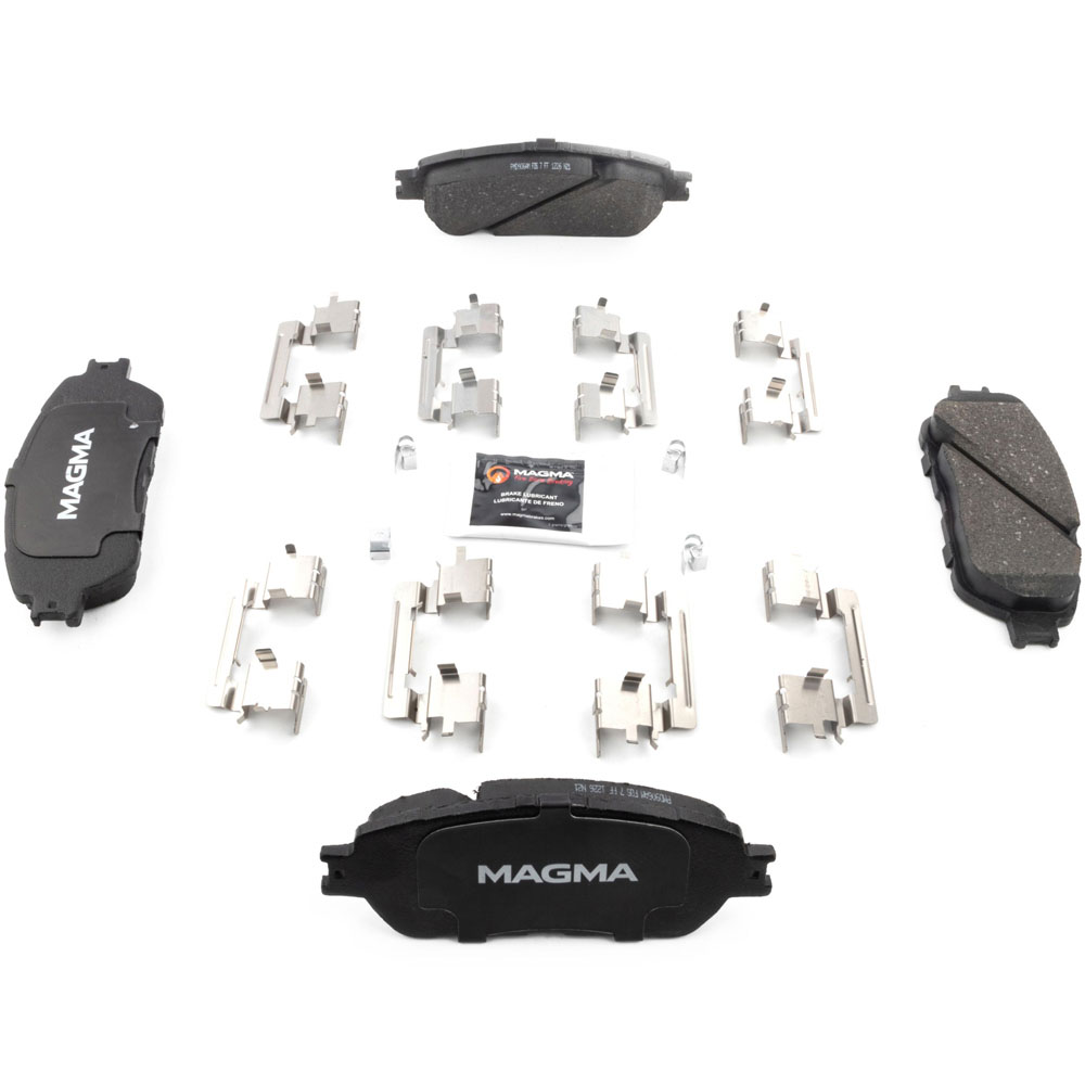 WHY MAGMA? - Today's harsh braking environments can create very high heat levels in your braking system which can reduce the vehicle's ability to stop. Extreme high temperatures can be reached in many braking situations such as - Stop and Go Traffic, Mountain Driving, Hauling or Towing, Emergency Stops, Spirited Driving and Long, Sustained Braking. At MAGMA Brakes, we use FIRE to fight FIRE. Our brake system components are made using advanced, state of the art techniques and treatments that ensure our brakes will stand up to the heat.MAGMA Premium brake pads feature...1. Scorched, copper-free friction formulations for optimal stopping power2. Heat-treated rubberized multi-layer shims for superior noise dampening3. Heat-tempered stainless steel hardware kits to restore the brake pad to caliper interface (where applicable)4. High-heat resistant brake lubricant included for lubricating critical points during pad installation