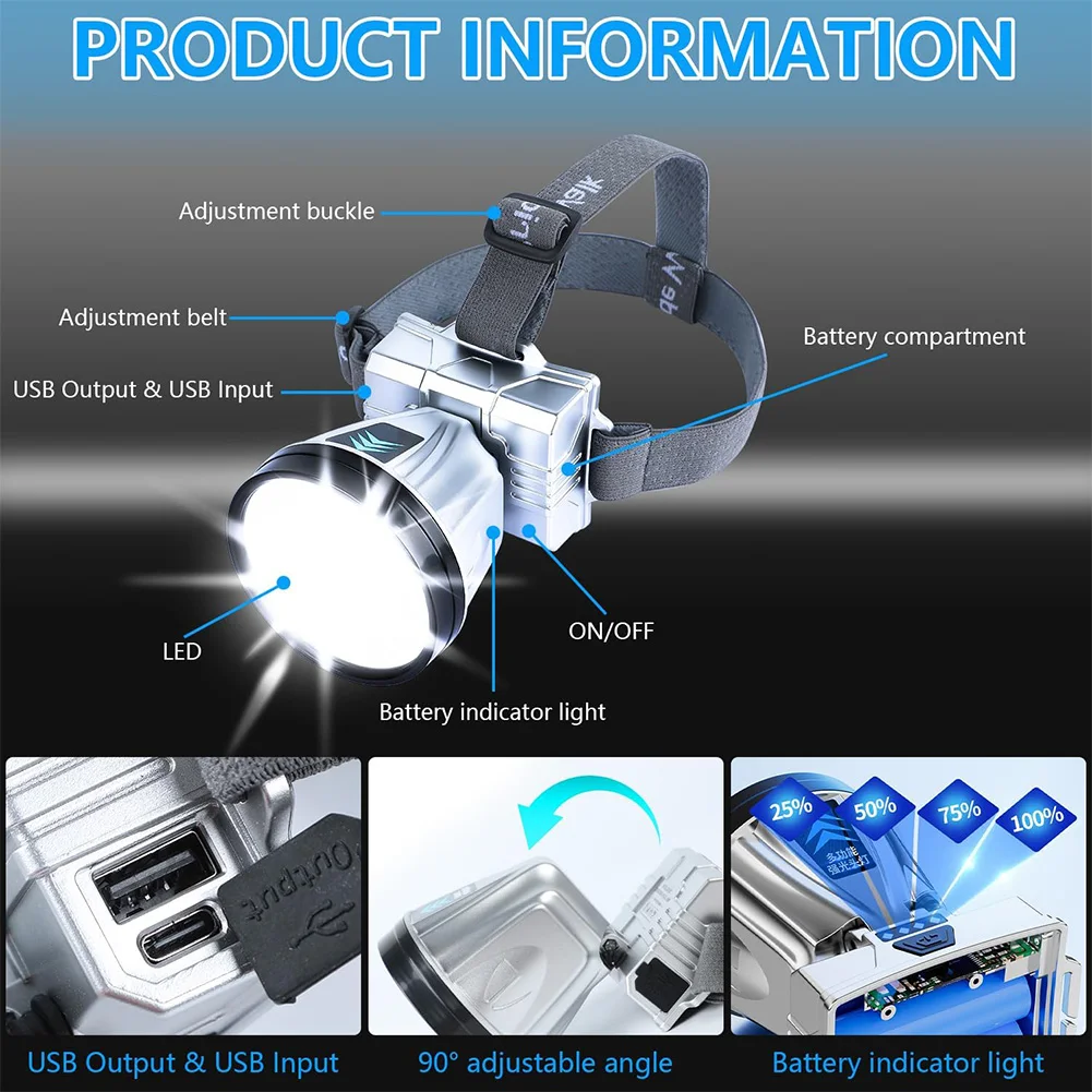 3. Built-In Power Bank Functionality: The super bright head lamp's integrated battery doubles as a power bank, allowing you to charge your phone on-the-go during outdoor excursions or emergencies.