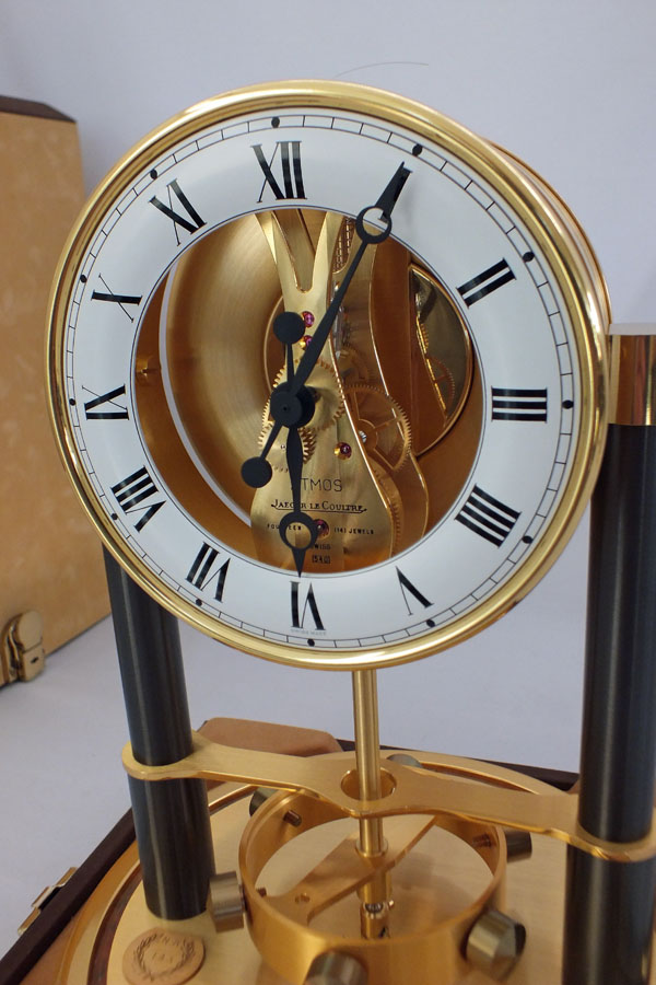 Fresh from a Dallas estate comes this clock by Jaeger Lecolutre. This is the Atmos 150th Anniversary model with the domed glass cover. This example is in great shape with the original boxe. The metalwork is all bright and nothing is cracked or tarnished. There are no dings and nothing has been replaced. This is serial number 601189. Nothing has been cleaned, repaired or altered.