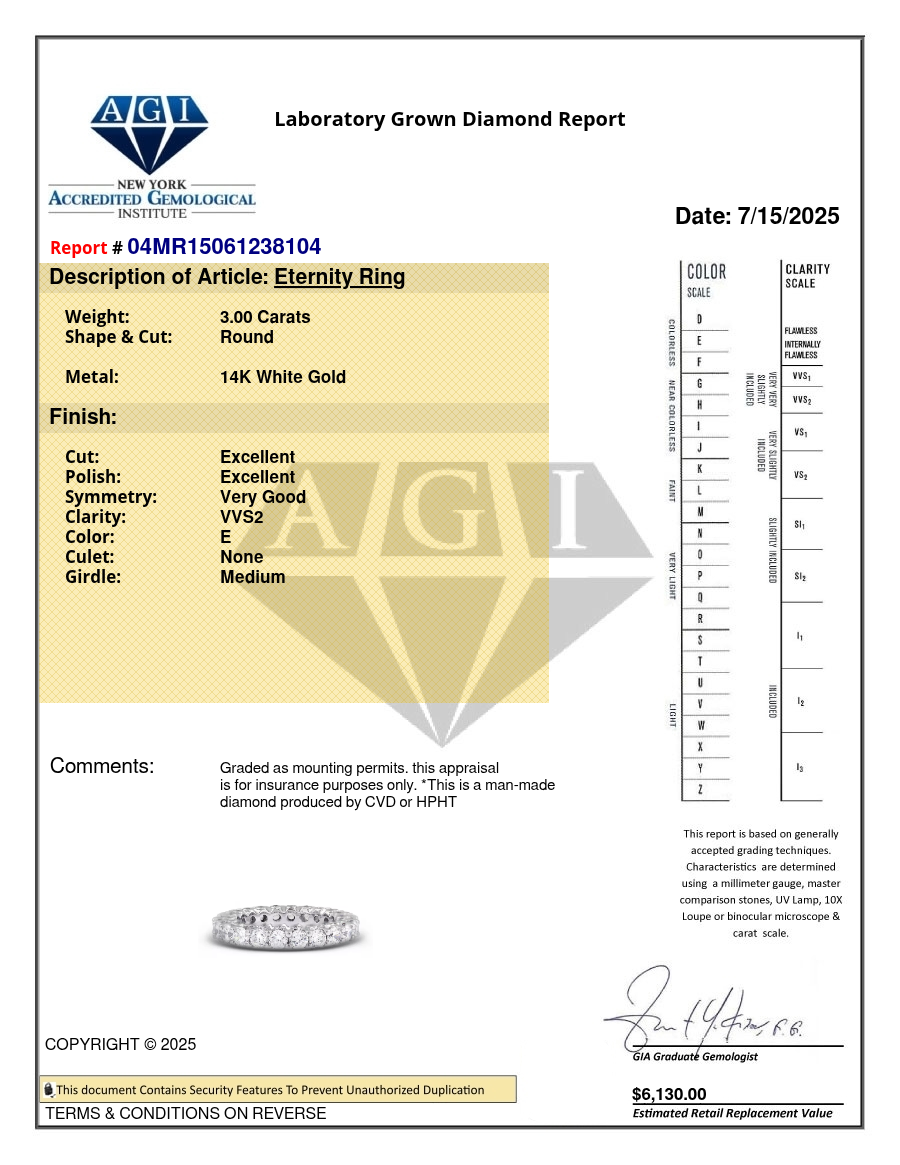 Solid 14K White Gold Eternity Wedding Ring Bezel Set AGI Cert 3 CT Round Lab-Grown Diamond E VVS2