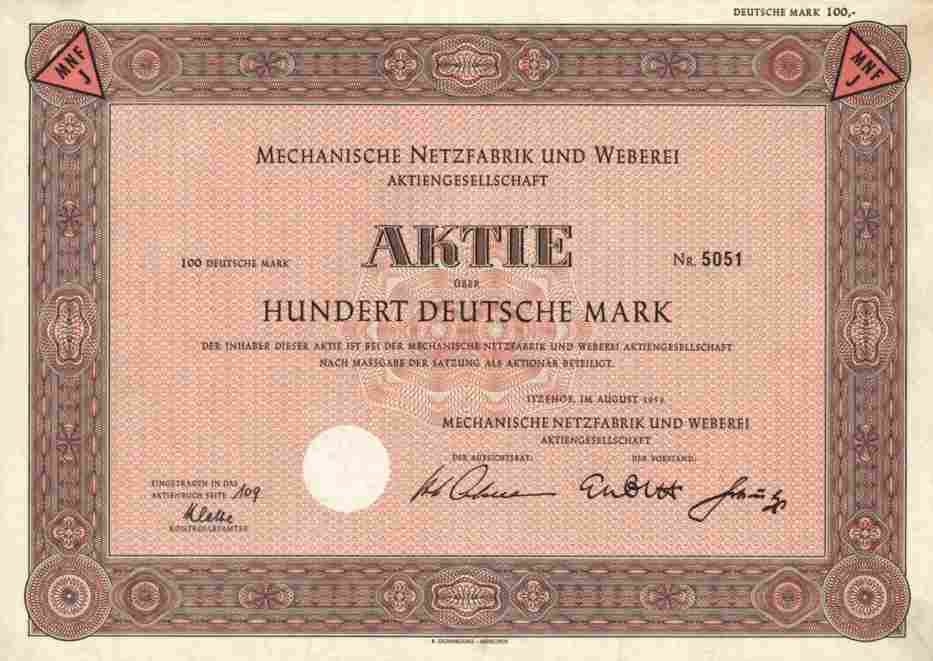 Interessante Textil - AKTIE - die 100er kaum angeboten !!!! Originalaktie -- siehe Bild -- der Mechanische Netzfabrik und Weberei AG, Aktie zu 100 DM, Itzehoe im August 1953. Die Gründung erfolgte bereits 1873. Erzeugung von Fischnetzen, Filetnetzen und Netzzwirnen. Aufgegangen in der Itzehoe Netzfabriken (INEFA), die Fenster- und Türenelemente vertrieb und montierte. Für die Firma kam mit dem Insolvenzverfahren 2002 der endgültige Niedergang. Firmenemblem "MNF" oben in den Ecken des Zierrandes und geprägt im Trockensiegel. Sammlerfreundlicher Sonderpreis !