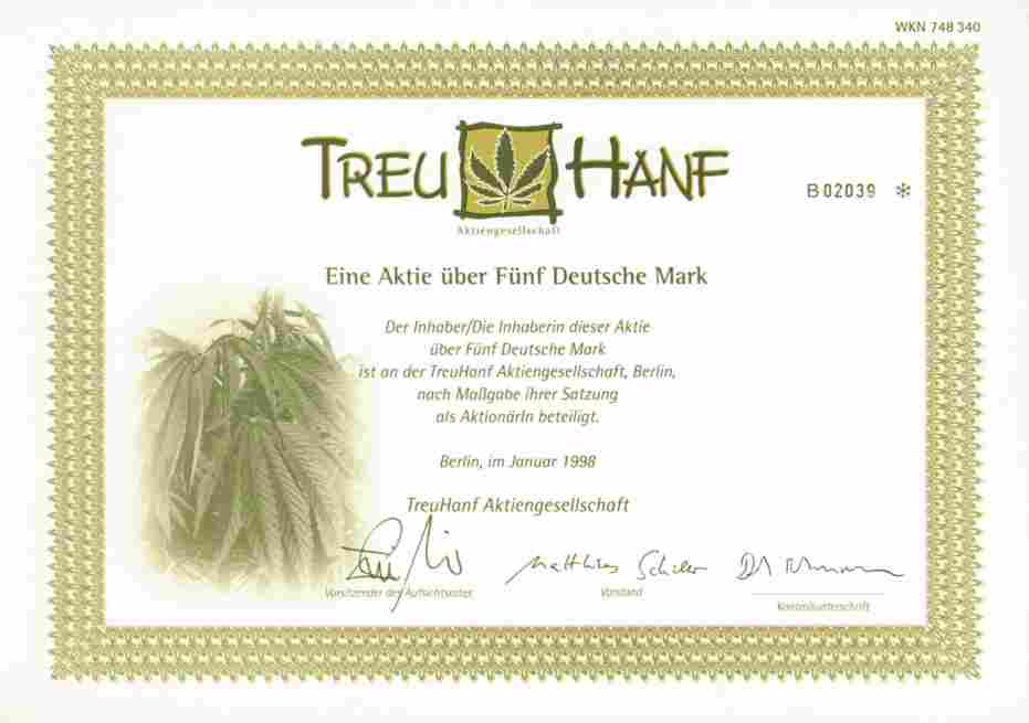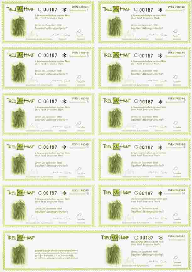 RARES Datum vom Januar 1998 - Gründeraktie. Orginalaktie Lit. B - siehe Bild - Einzelstück - über 5 DM der TreuHanf A.G., Berlin vom Januar 1998. Die Treuhanf AG wurde 1997 in Beiersdorf-Freudenberg gegründet. Die TreuHanf AG stellte 2004 einen Insolvenzantrag beim Amtsgericht Frankfurt/Oder. Grund für die Insolvenz sollte eine hohe Schadensersatzforderung des rumänischen Staatseigentumsfonds gewesen sein. Nach Zurückweisung des Insolvenzantrages befindet sich die Gesellschaft per Gesetz in Liquidation. Eine Kapitalerhöhung war notwendig. Frei bleibende Aktien sollen vom Investment-Partnern der GSDP (Gerling Sustainable Development Project GmbH) übernommen werden. Die Tochter des Gerling Konzerns arbeitet mit der UN bei der Akquisation von Fondsmitteln für nachhaltige Projekte zusammen. Die GSDP engagiert sich zusammen mit TreuHanf bei der Produktion nachwachsender Rohstoffe im Länderdreieck Rumänien/Ungarn/Jugoslawien. Die GSDP soll das Projektmanagement übernehmen die Kommunikation zur Industrie und das Einsammeln von Geld. Die Kapitalerhöhung sollte eine Beteiligung an der "Flachshaus GmbH" bereit stehen. Die "Flachshaus" hat einen erfolgreichen Dämmstoff aus Flachsfasern entwickelt. "Flachshaus" benötigt für notwendige Erweiterung der Produktionskapazitäten frisches Kapital. Für TreuHanf sollten sich erhebliche Synergieeffekte zwischen der Hanffabrik Zehdenick und dem Flachshaus Pritzwalk (Nordbrandenburg) ergeben. BESONDERHEIT: Kuponbogen und Erneuerungsschein unentwertet anbei !!! Firmenemblem oben und dekorative Flachspflanze links. Sammlerfreundlicher Sonderpreis !