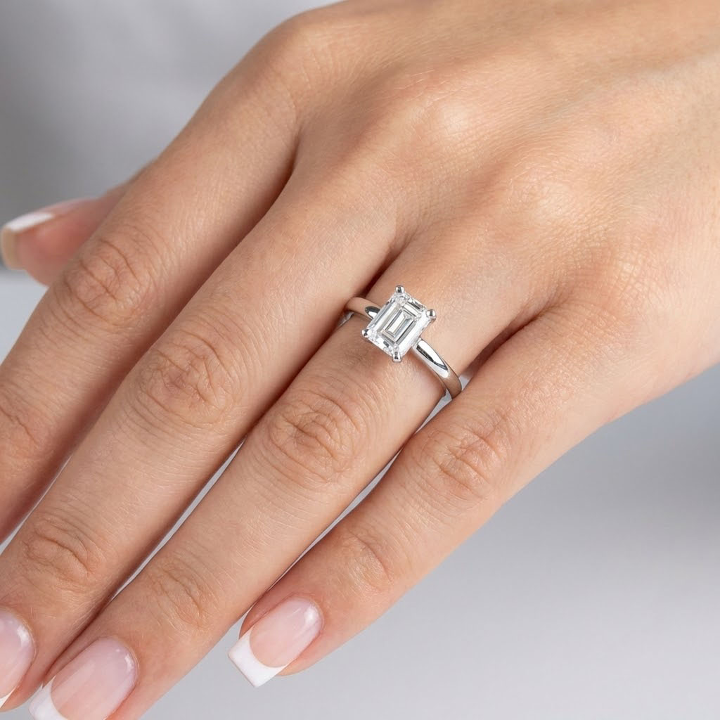 Elevate your love story with this exquisite lab-grown emerald solitaire engagement ring, designed to symbolize your unique journey together. The classic basket design features a stunning emerald-cut diamond, securely showcased in a refined four-prong setting, ensuring brilliance and elegance. Perfect for proposals or marking anniversaries, this ring holds an emotional connection and evokes joy with every glance. Crafted with sustainability in mind, it’s a timeless piece that represents your commitment and shared dreams, making it a cherished investment for years to come.