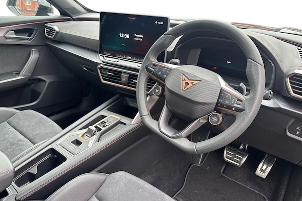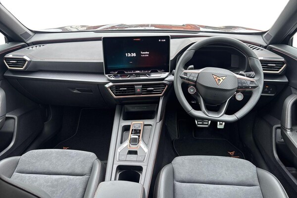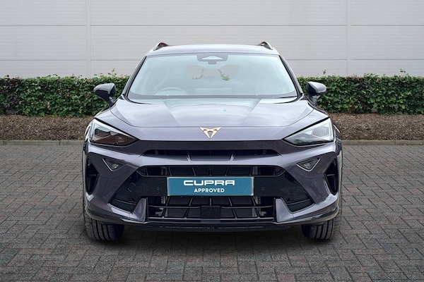 Available from 01/07/2026. CUPRA Formentor Estate 1.5 eTSI 150 V2 5dr DSG in Dark Void. Specification Includes Exterior Features,Premium Metallic Paint,Audio / Communications,7 Speakers,Paint - Special,Premium Metallic - Dark Void,Trim - Part Leather,Pvc/Dinamica Cloth - Black With Copper Stitching And Embroidered Cupra Logo In Headrest + Bucket Seats,Wheels,19in Sandstorm Machined Sport Black And Silver Alloy Wheels,Breakdown And Tool Kit,Exterior Features,Electric Front/Rear Windows,Rain Sensing Wipers,Rear Wash/Wipe,Tinted Rear Windows,Cupra Sport Suspension,Body Colour Door Handles,Body Coloured Bumpers,Gloss Black Roof Rails And Window Surrounds,Rear Diffuser With Black Simulated Exhaust Pipes,Rear Side Wing Doors,Daytime Running Lights With Automatic Headlight Control And Coming And Leaving Home Function,Door Panel Ambient Lighting,Dynamic Headlight Range Control,High Beam Assist,Led 3rd Brake Light,Led Front Fog Lamps With Cornering Function,Led Headlights,Led Taillights With Dynamic Indicator,Rear Fog Lights,Welcome Lights (within Exterior Mirror Housing),Safety,Abs,Brake Control System - Esc And Brake Booster,Electronic Parking Brake,Front And Rear Disc Brakes,Hill Hold Control,Adaptive Cruise Control With Follow-To-Stop And Speed Limiter,Driver Alert System With Driver Monitoring,Driving Profile Selection,Dynamic Road Sign Display,Forward Collision Warning With Automatic Braking,Front And Rear Parking Sensors,Front Cross Traffic Assist,Lane Assist,Progressive Steering,Rear View Camera,Auto Dimming Rear View Mirror,Dark Grey Wing Mirror,Electrically Adjustable Heated And Folding Door Mirrors With Memory Function,3 Point Seatbelts On All Rear Seats,Child Proof Door Locks,Driver And Front Passenger Airbags With Front Passenger Airbag De-Activation,Front Side Curtain Airbags,Public E-Call,Seat Belt Reminder For Front And Rear Seats,Tyre Pressure Monitoring System,Audio / Communications,Voice Control System,Wired Android Auto,Wireless Apple Carplay,2 Front And 2 Rear Usb Type C Sockets,Media System With Navigation- 12.9in Touchscreen Display- Voice Control- Dab- Steering Wheel Mounted Controls,Driver Convenience,Start/Stop System With Regenerative Braking,Virtual Pedal And Electric Tailgate,Wireless Phone Charger,Miscellaneous,10.25in Digital Cockpit And Configurable Dashboard,Emergency Steering Support With Turn Assist,Full Link Phone Integration,Rpm- Trip Computer- Outside Temp Gauge- Instrument Light Brightness- Low Fuel Warning Light- Lights On