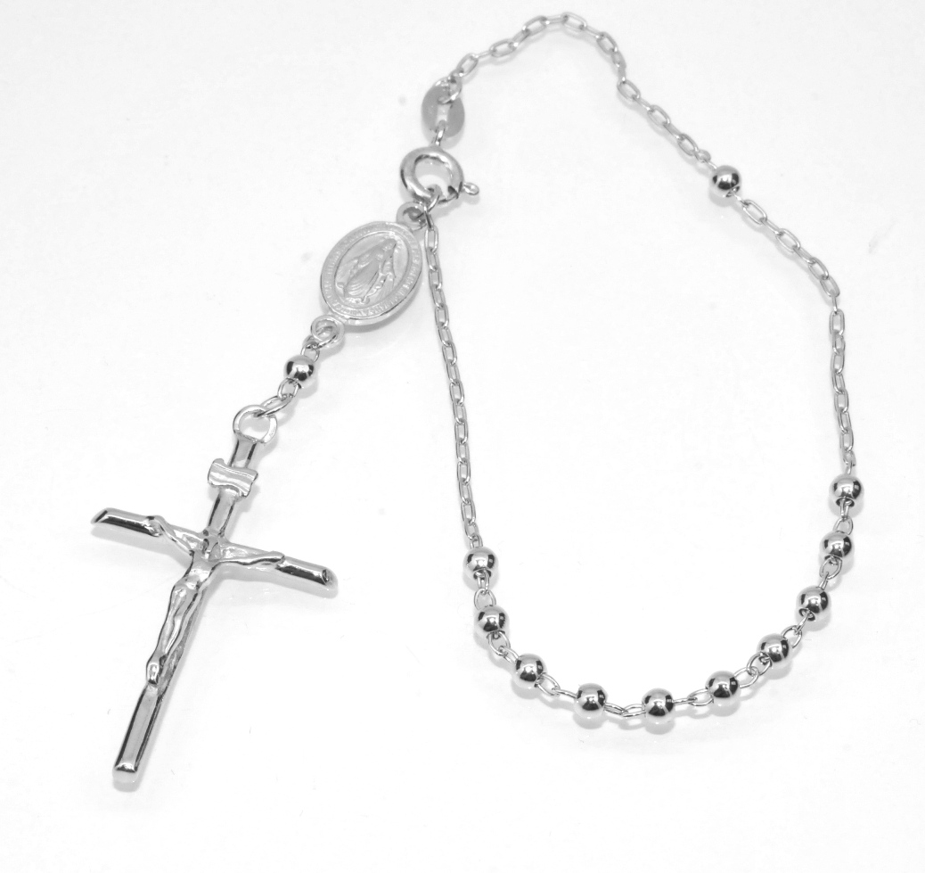 Our Sterling Silver Beaded Rosary bracelet combines exquisite beauty with powerful meaning. Eleven gleaming silver beads are strung on a link chain, also comprised of sterling silver. At the end of the chain is a delicate and simple cross. This silver rosary bracelet is adjustable from just under 7 inches to 8 1/2 inches, making it ideal for a wide variety of wrist sizes. Adorn your wrist with a look both timeless and significant.
