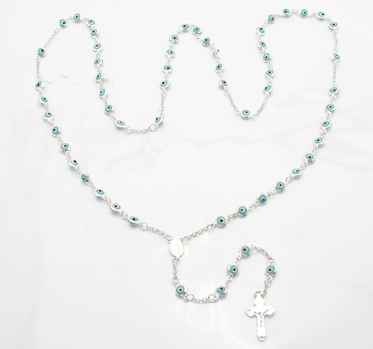 Solid Ocean Blue Baby Evil Eye Crucifix Rosary Chain Real 925 Sterling Silver