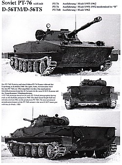 | Während des Zweiten Weltkrieges baute die Rote Armee ihre Pioniertechnik zum Überqueren von Wasserhindernissen dramatisch aus. Nach dem Krieg wurde die Notwendigkeit der Beschaffung eines leistungsfähigen, amphibischen Kampffahrzeugs, mit ausreichend Feuerkraft um einen Brückenkopf zu nehmen und zu halten, überdeutlich. Der Schwimmpanzer PT-76 sollte hier das Rückgrat der amphibischen Operationen des Kalten Krieges werden. Er diente in der Sowjetarmee, aber auch in den Warschauer-Paket Streitkräften wie der Polnischen Volksarmee und der NVA der DDR. |