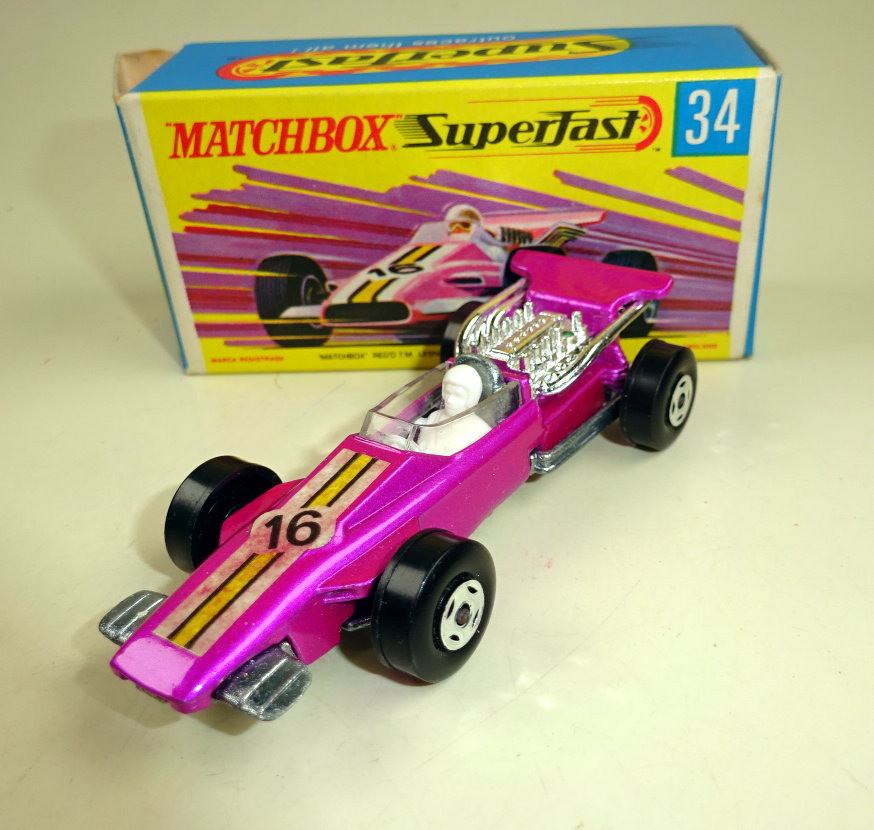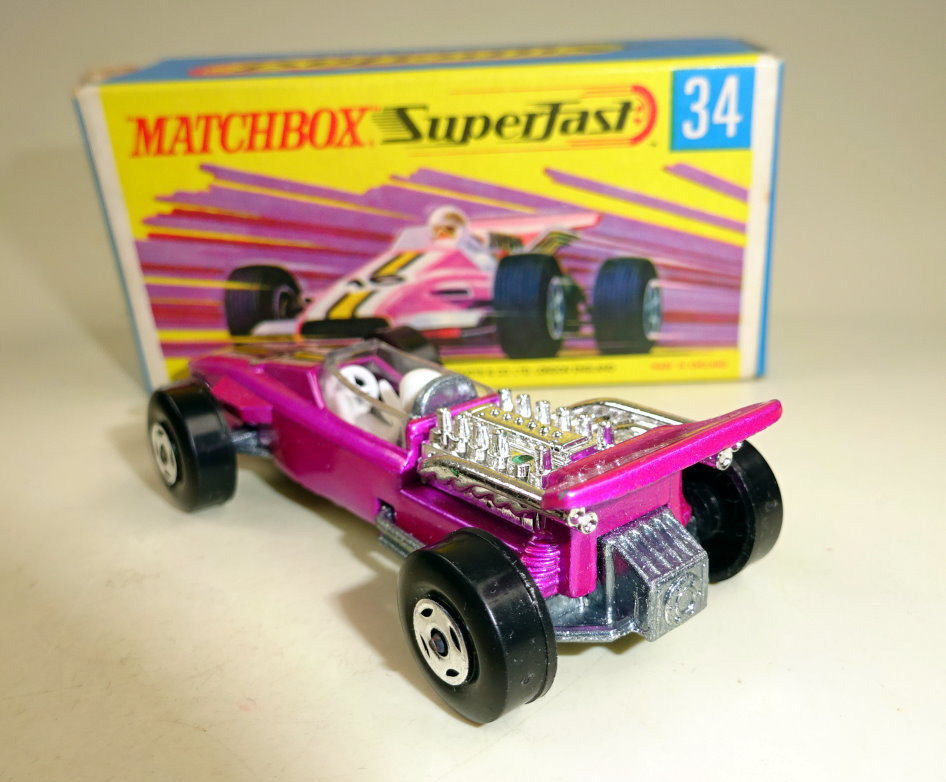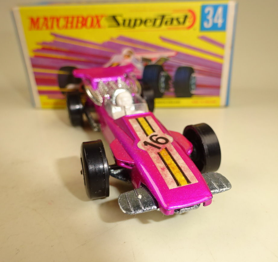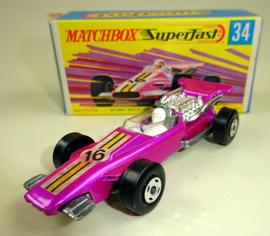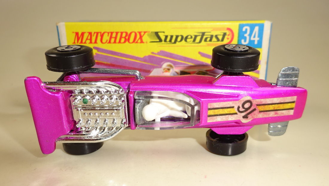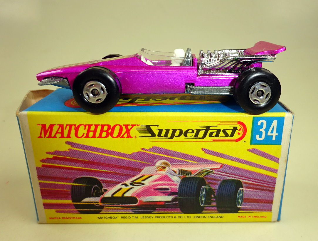 Willkommen bei den Ebay Angeboten von Harveys-Matchbox! Sie sammeln Matchbox Modelle? Dann klicken Sie links auf die gewünschte Shop Kategorie oder beginnen mit der Startseite. Mehr als tausend Modelle und Zubehör erwarten Sie! Alle jene Sammler welchen meinen Onlineshop kennen werden die Struktur der Artikelgruppen hier im Ebay Shop erkennen, ich versuche alle Angebote in möglichst aussagekräftigen Kategorien zusammen zu fassen. Da niemand alles von Matchbox sammelt sind die einzelnen Hauptsammelgebiete wie Regular Wheels, Lesney Superfast aus England oder Superfast aus Fernost Produktion getrennt und dann noch nach den Nebenlinien aufgeschlüsselt. Wenn Sie genau wissen nach welchen Modellen Sie suchen benutzen Sie bitte die Suchfunktion. Es sind nicht alle Modelle aus meinem Onlineshop hier bei Ebay gelistet, sollten Sie hier nicht fündig werden schauen Sie mal dort nach. Mehr Informationen finden Sie auf der mich Seite! Hier biete ich an: Matchbox Superfast Serie Lesney / Made in England 1969 - 1983 Nummer 34A Formula 1 Racer Lilametallic, schmale 4 spoke Räder