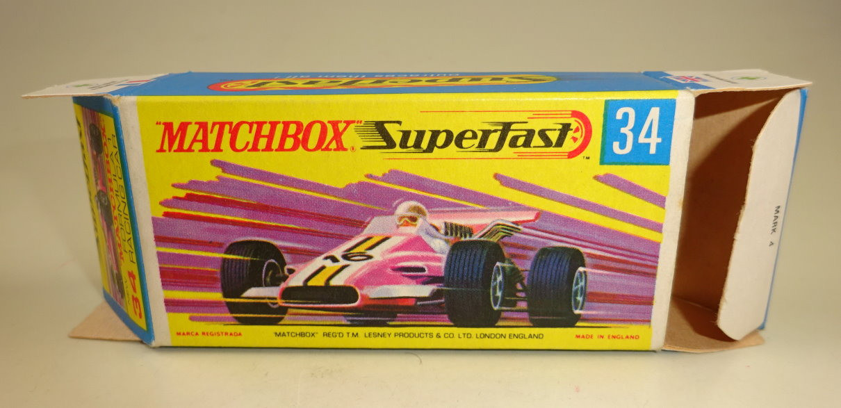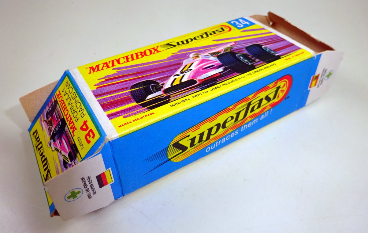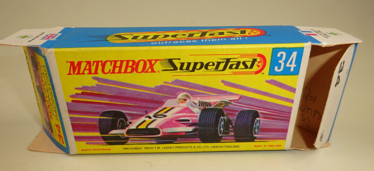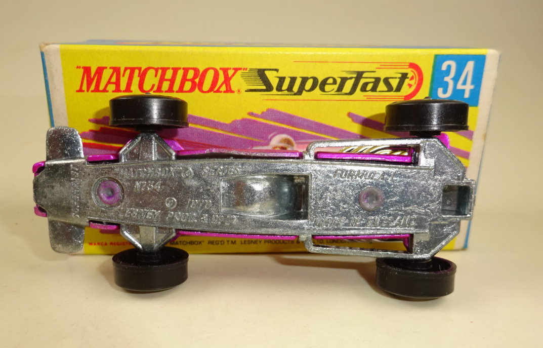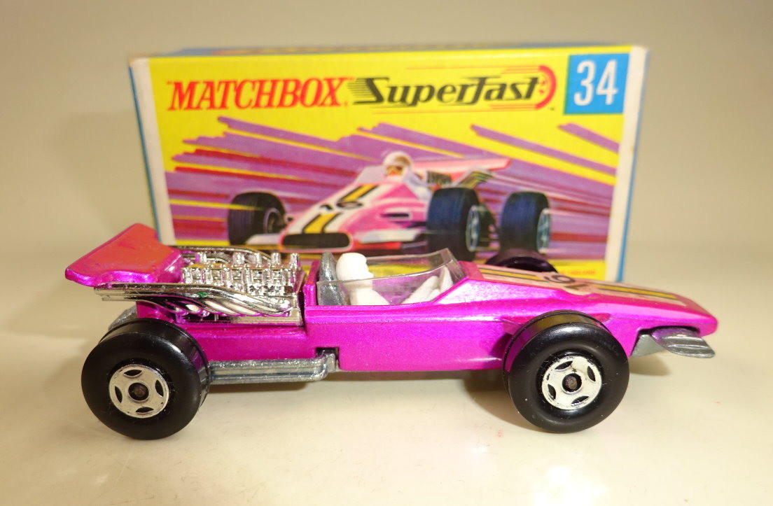 Willkommen bei den Ebay Angeboten von Harveys-Matchbox! Sie sammeln Matchbox Modelle? Dann klicken Sie links auf die gewünschte Shop Kategorie oder beginnen mit der Startseite. Mehr als tausend Modelle und Zubehör erwarten Sie! Alle jene Sammler welchen meinen Onlineshop kennen werden die Struktur der Artikelgruppen hier im Ebay Shop erkennen, ich versuche alle Angebote in möglichst aussagekräftigen Kategorien zusammen zu fassen. Da niemand alles von Matchbox sammelt sind die einzelnen Hauptsammelgebiete wie Regular Wheels, Lesney Superfast aus England oder Superfast aus Fernost Produktion getrennt und dann noch nach den Nebenlinien aufgeschlüsselt. Wenn Sie genau wissen nach welchen Modellen Sie suchen benutzen Sie bitte die Suchfunktion. Es sind nicht alle Modelle aus meinem Onlineshop hier bei Ebay gelistet, sollten Sie hier nicht fündig werden schauen Sie mal dort nach. Mehr Informationen finden Sie auf der mich Seite! Hier biete ich an: Matchbox Superfast Serie Lesney / Made in England 1969 - 1983 Nummer 34A Formula 1 Racer Lilametallic, schmale 4 spoke Räder