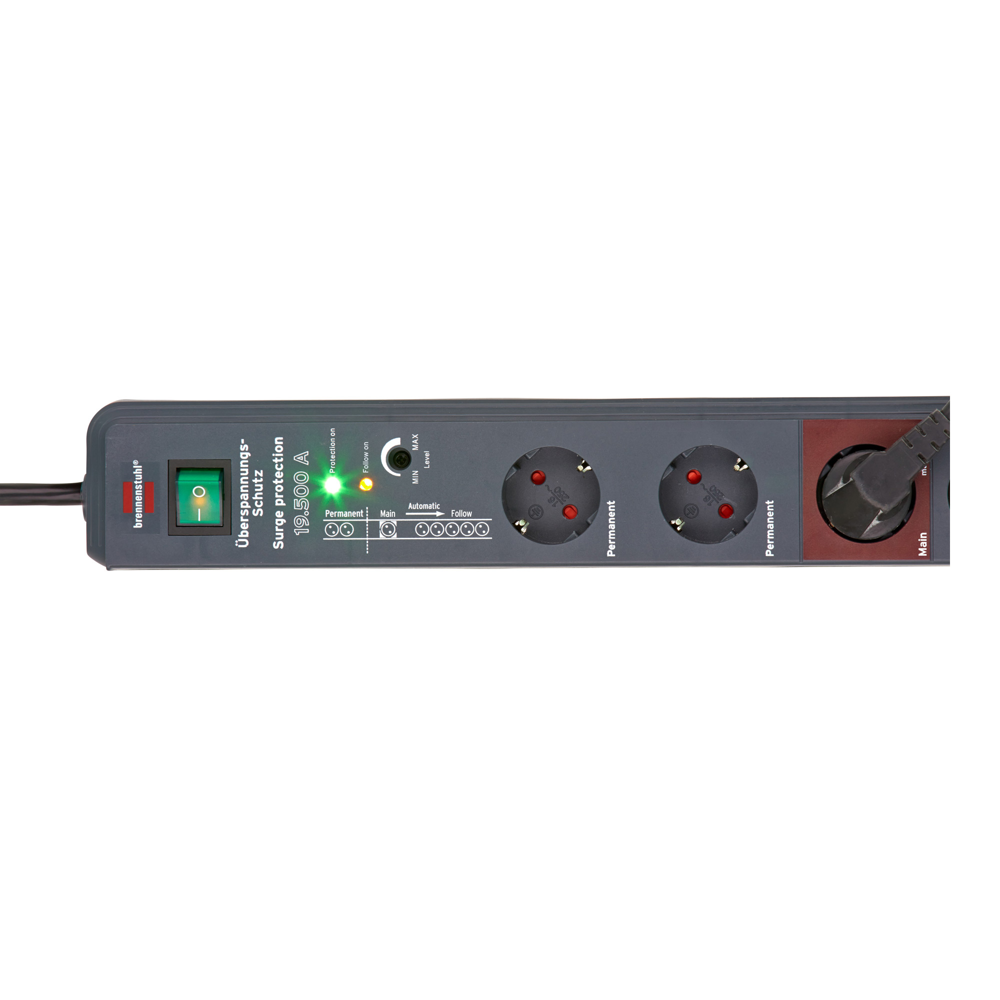 Die Secure-Tec 8er Mehrfach-Steckdosenleiste von Brennenstuhl in der Farbe anthrazit und 3m Kabel besticht durch ihre Qualität und Sicherheit in allen Bereichen. Das Gerät hat ein praktisches Automatik-Schaltsystem mit Main Follow Funktion. Das Main-Gerät (z.B. einen Computer) kann die Follow-Geräte (z.B. Monitor, Soundsystem, Drucker, Scanner usw.) in die automatische Steuerung mit einbeziehen. Mit dem Ein/Aus Schalter des Gerätes (in roten Main-Steckdose eingesteckt) können alle Geräte (in den Follow-Steckdosen) automatisch mit ein und ausgeschaltet werden. Sie verfügt nicht nur über einen erhöhten Berührungsschutz, sondern überzeugt außerdem durch folgende Eigenschaften: