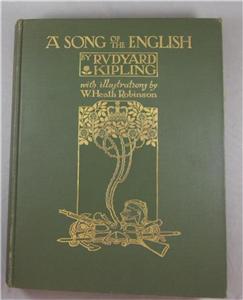 A SONG OF THE ENGLISH BY RUDYARD KIPLING AND ILLUSTRATED BY W HEATH ROBINSON AND PUBLISHED BY DOUBLEDAY PAGE AND CO IN NOVEMBER 1909 FIRST AMERICAN ILLUSTRATED EDITION WITH 30 TIPPED IN COLOR PLATES AND 59 BLACK AND WHITE ILLUSTRATIONS. A BEAUTIFUL BOOK! BOOK IS IN VERY GOOD CONDITION WITH SLIGHT SLANT, SHELF AND EDGE WEAR. POSTAGE $4.00 BY MEDIA MAIL IN THE UNITED STATES AND BY ARRANGEMENT OVERSEAS. I COMBINE ORDERS TO SAVE ON POSTAGE. PAYMENT CAN BE MADE BY PAYPAL........