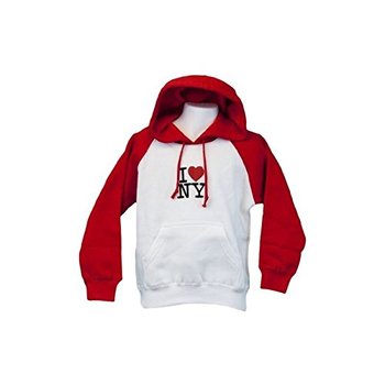 Licensed, authentic "I Heart NY" Kid's hoodied cotton sweatshirt! I Love New York hoodie has a red hood and a white body with a glitter heart. Comes in standard youth sizes XS 2-4 up to L 14-16.