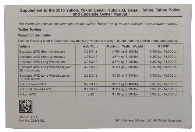 Click Thumbnails to EnlargeThis is the owners manual, towing specs sheet, and leather carrying case for US models of 2015 Cadillac Escalade and Escalade ESV vehicles. This listing comes with the owners manual, the towing weight specifications sheet, and the black leather carrying case. The leather case has the Cadillac name logo imprinted on the front, two slots for insurance cars, and a magnetic lid. All of the manuals and guides are printed in English. This is the set that would be in the glove box when the vehicle was purchased new. Replace your old, lost, or damaged owners manual set with this brand new, factory original part from General Motors.