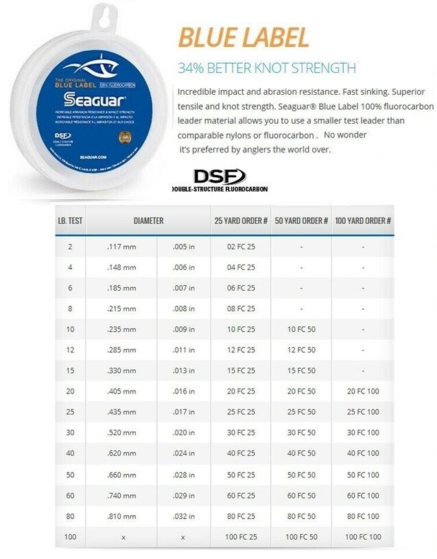 50 YARD SPOOL ** BRAND NEW ** SEAGUAR BLUE LABEL 100% FLUOROCARBON LINE PICK YOUR SIZE!