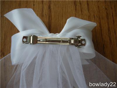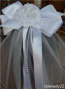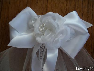 White Satin Bow with streamers of Satin ribbons and pearls and Sewn or Rose Lace Edged Veil attached.