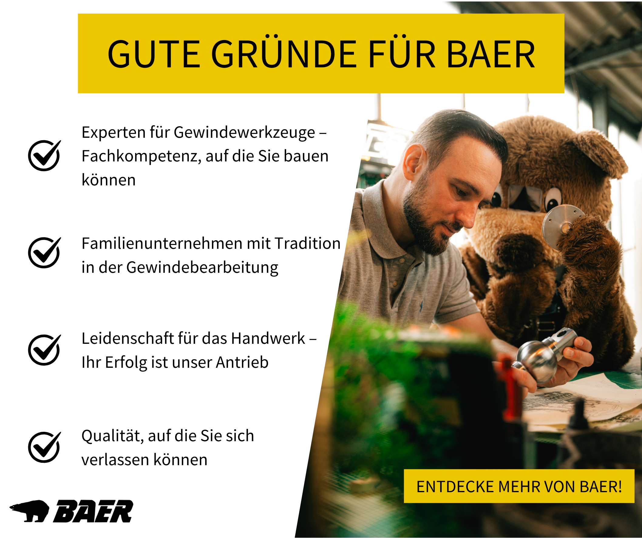 BAER Tools GmbH ist Ihr zuverlässiger Partner für Gewindewerkzeuge und innovative Lösungen rund um die Gewindetechnik – seit über 40 Jahren, familiengeführt und ISO 9001-zertifiziert.