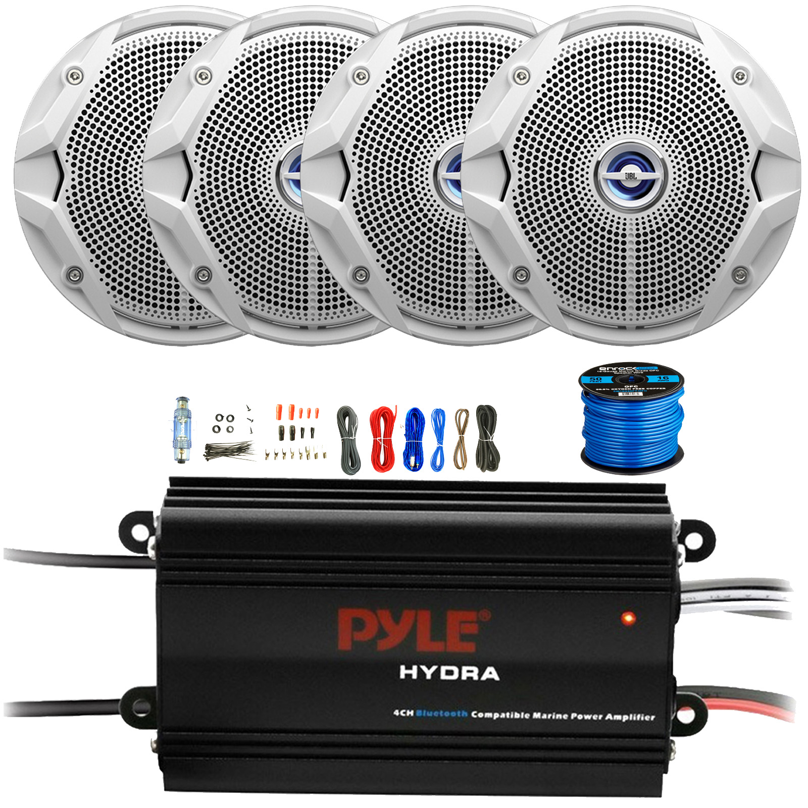 Two Pairs (QTY 4) Of JBL 6.5" 180 Watts Max Power Dual Cone White Marine Coaxial Speakers, 4-Channel Bluetooth Boat Amplifier, 8 Gauge Amplifier Wiring Installation Kit, 50 Feet 16 Gauge Speaker Wire