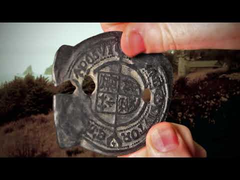 Cast in metal and carefully antiqued to look like old, tarnished silver, this reproduction is a 2 1/2" oversized version of a 17th century doubloon, the back of this piece dated at 1632.