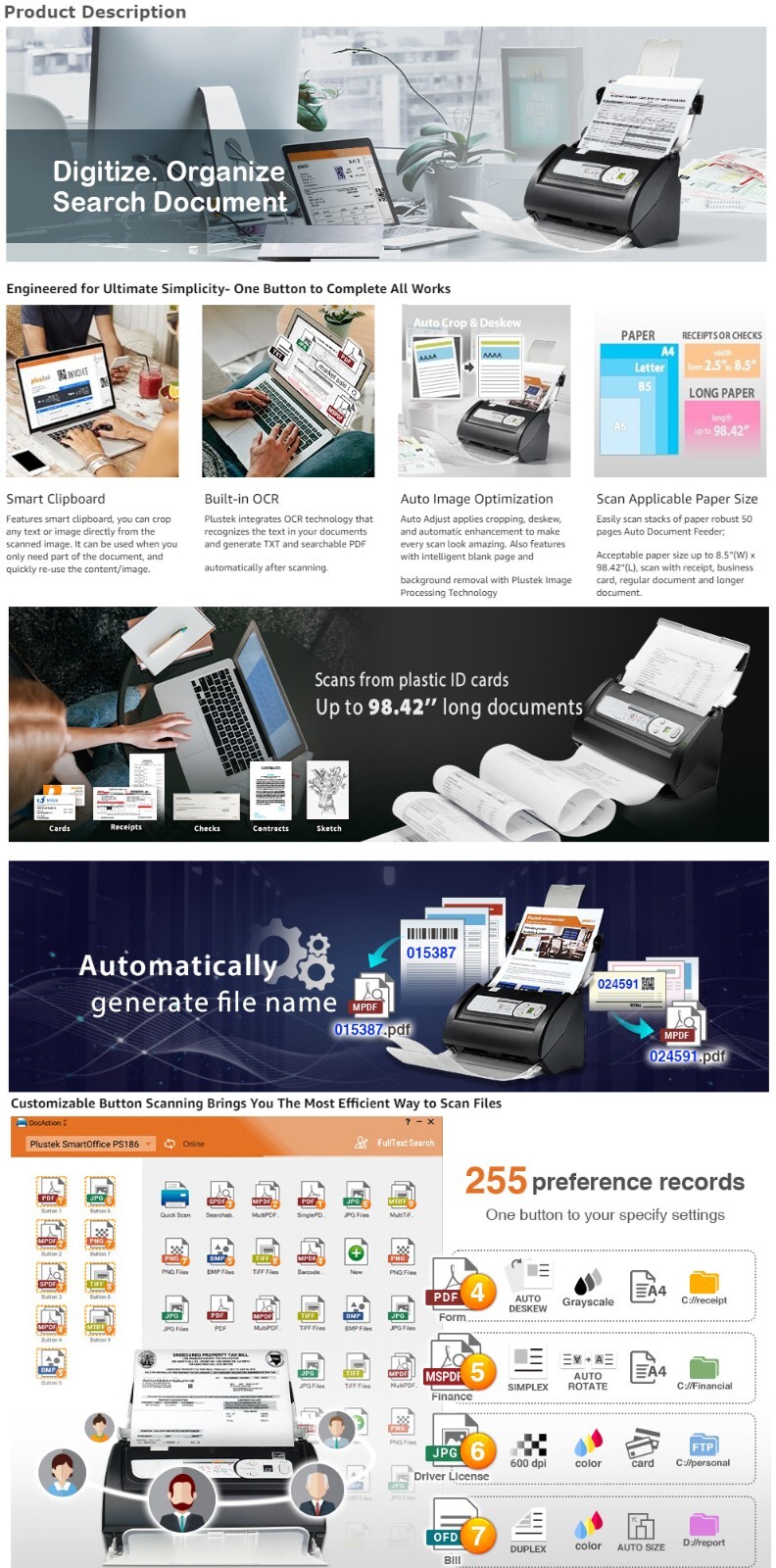 Intelligent color and image adjustments — Auto Rotate, Crop, Deskew and blank page remove with Plustek Image Processing Technology
