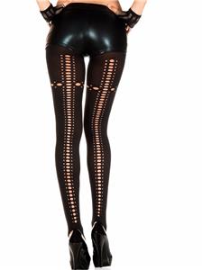 - Description: Opaque black pantyhose with unique, ripped back seam pattern and ripped mid-thigh detail. Shorts not included.