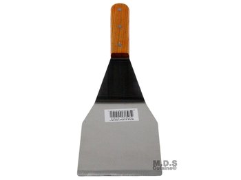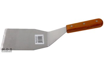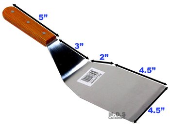 This stainless steal spatula has a wooden handle, that gives it a sophisticated and stylish look. It's blade is 6 inches long 4.5 inches wide, making it the perfect size for flipping large or small foods.
