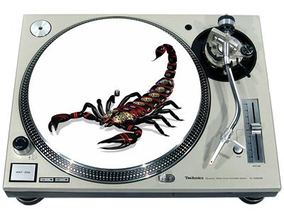 High quality felt turntable slipmat imprinted with an image of a scorpion. The mat is regular thickness (3/32" or 2mm) and is sized to fit any turntable.  It is anti static, has a glazed bottom to grip and avoid slippage, feels great and works well for scratching or just playing your records.  The image is impregnated into the surface of the mat, so it cannot scratch off or damage the record.