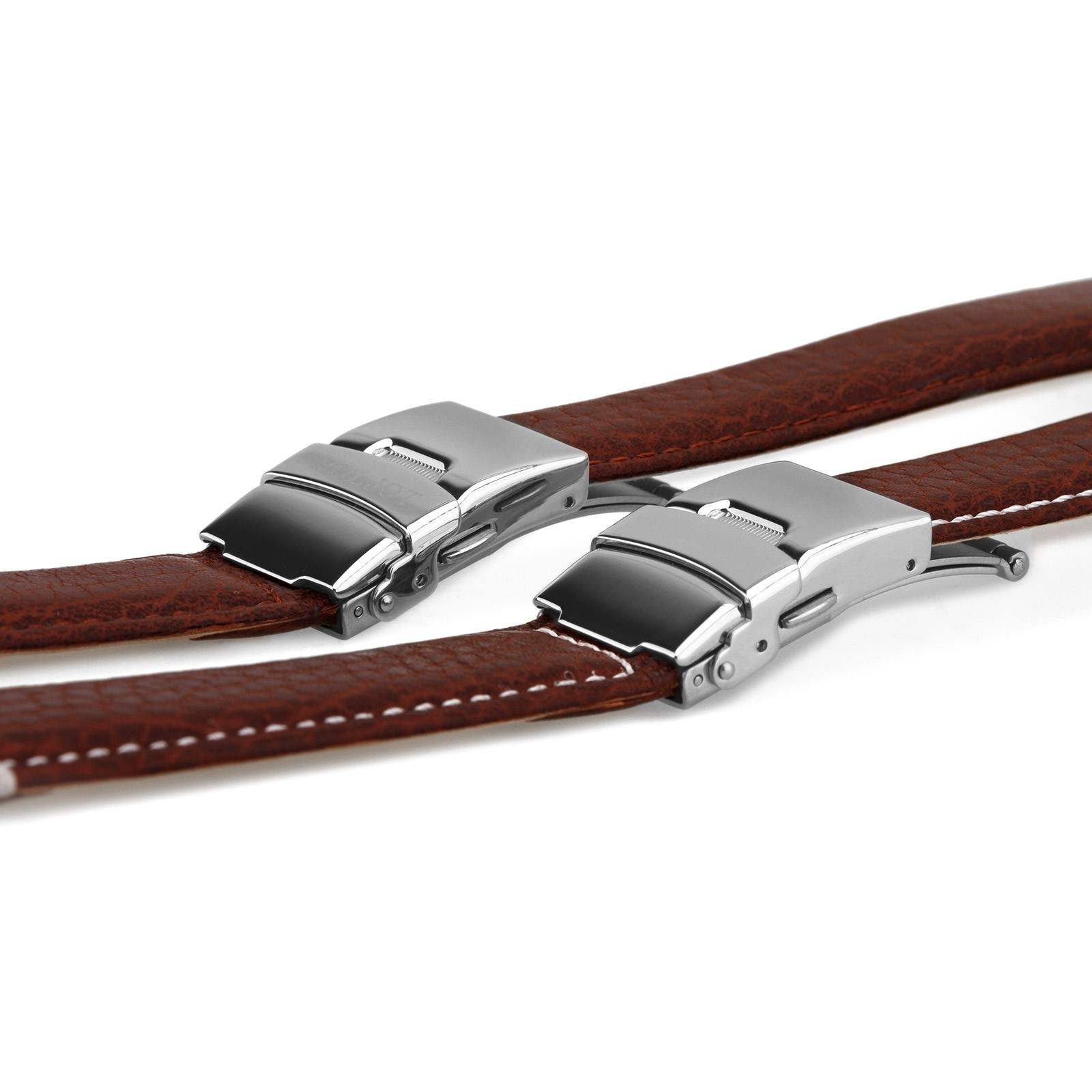 Das Armband ist aus qualitativem Leder gefertigt. Es ist weich, leicht gepolstert, durchgehend mit farbig abgestimmter Naht abgesteppt (braun oder weiß). Die Oberseite ist mit dunkelbraunem seidenmatt glänzendem Büffelleder bezogen (grob- oder feinnarbig), die Unterseite ist in ecru-farbenem Nubukleder gefertigt. Die polierte Edelstahlschließe verfügt über eine Sicherheitsklappe, sowie Seitendrücker zum öffnen. Die Gesamtlänge beträgt 19mm. Das Band lässt sich durch abschneiden des längeren Teils beliebig kürzen.