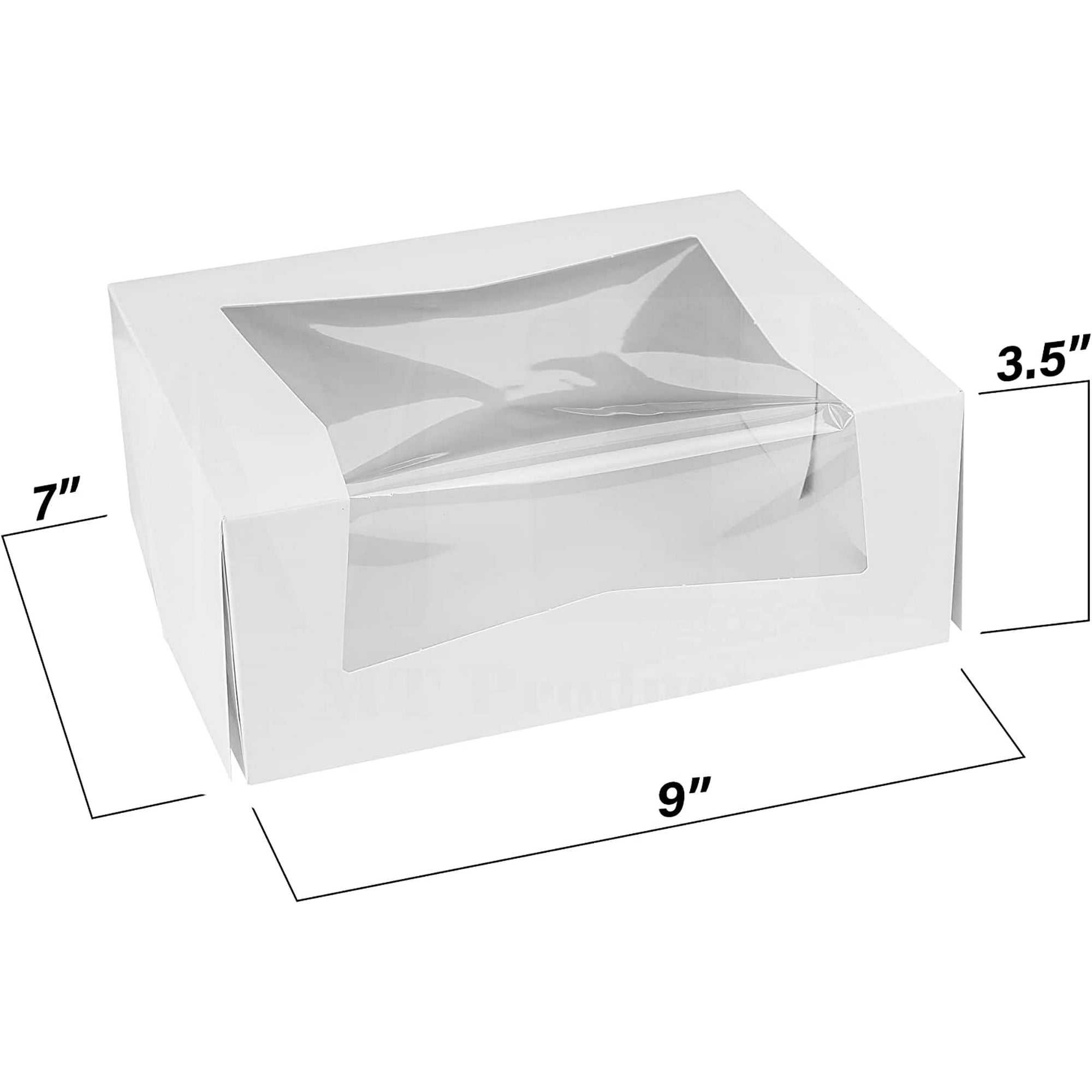MT Products Auto-Popup bakery boxes are the perfect way to keep all your delicious baked goods safe and mess-free. Its 9" Length x 7" Width x 3 1/2" size is perfect for securely packing chocolate-covered strawberries or chocolate chip bars in this attractive-looking box. The box comes along with some handy details like an auto-popup feature which allows for quick assembly, eliminating much time and effort, and a neatly designed clear window for product visibility. A clear window panel allows customers to view your treats without the mess. Use these boxes to send home some treats after a party or to pack up food for a picnic. They are a step up from your regular pastry boxes so you can wow others at a fundraising event or bake sale or when selling to customers. This is a pastry box like no other.