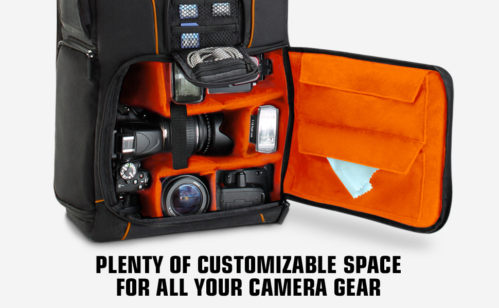 USA GEAR S17 Large Camera Backpack is a professional DSLR camera bag, mirrorless camera backpack, and drone backpack built for travel photography and outdoor use. This weather-resistant camera bag features durable fabric, a built-in rain cover, customizable padded dividers for cameras, lenses, and drones, plus accessory pockets and a tripod holder to keep gear organized. A quick-access side compartment lets you grab your camera fast, while padded straps and a breathable back panel add comfort. A dedicated 15.6-inch laptop compartment secures your laptop or tablet, making this all-in-one photography backpack ideal for photographers, videographers, and drone pilots for travel and work.