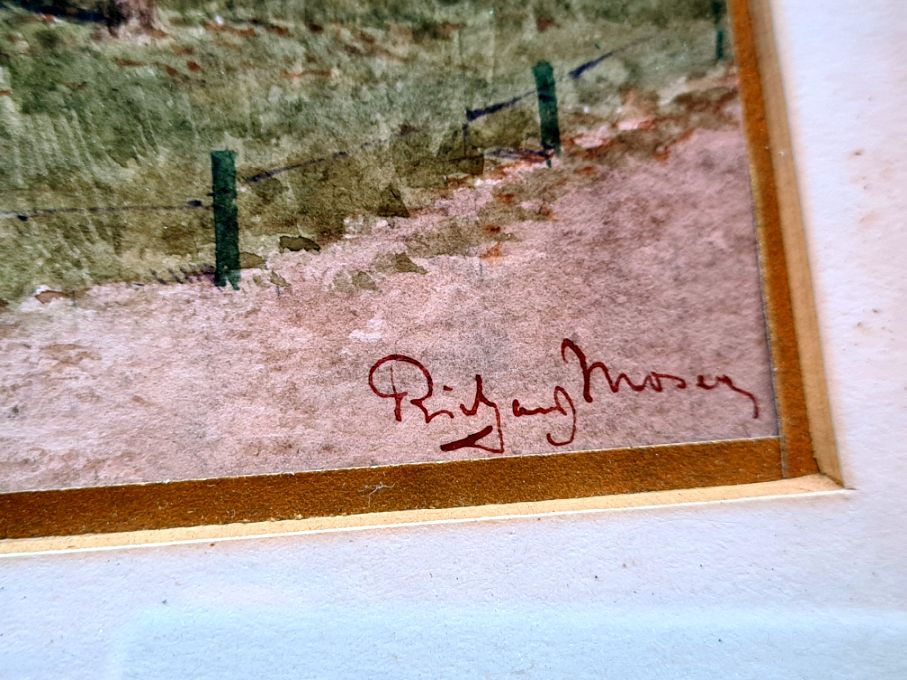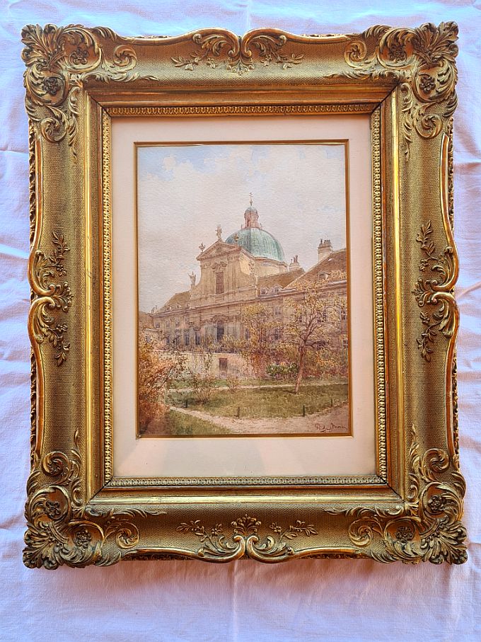 |  Description: Artist: Richard Moser (1874 - 1924) Theme: Salesian church Kind of Painting: watercolor / paper Mapping Value: 10.2 x 7.2 inches With framing: 18.4 x 15 inches Signature: Richard Moser Dated: verso / February 1922 Frame: gilded Frame (see photos)