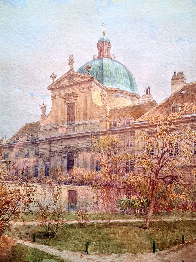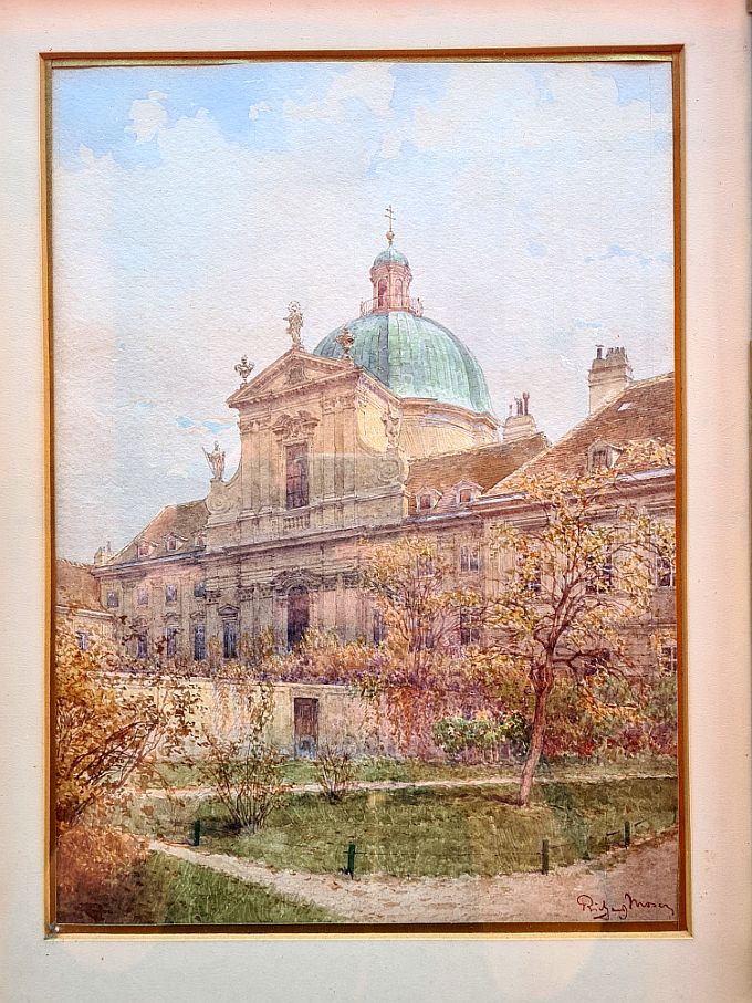 Beschreibung: Künstler: Richard Moser (1874 - 1924) Motiv: Salesianerinnen - Kirche Art der Malerei: Aquarell / Papier Abbildungsgröße: 26 x 18,5 cm Mit Rahmung: 47 x 38 cm Signiert: Richard Moser Datiert: verso / Februar 1922 Rahmung: vergoldeter Prunkrahmen