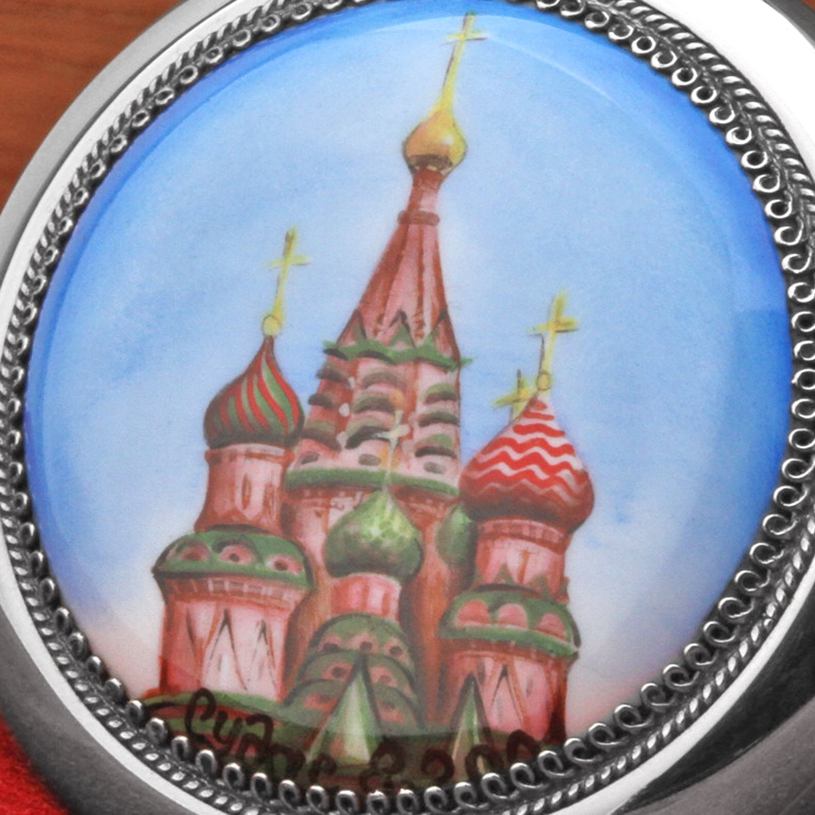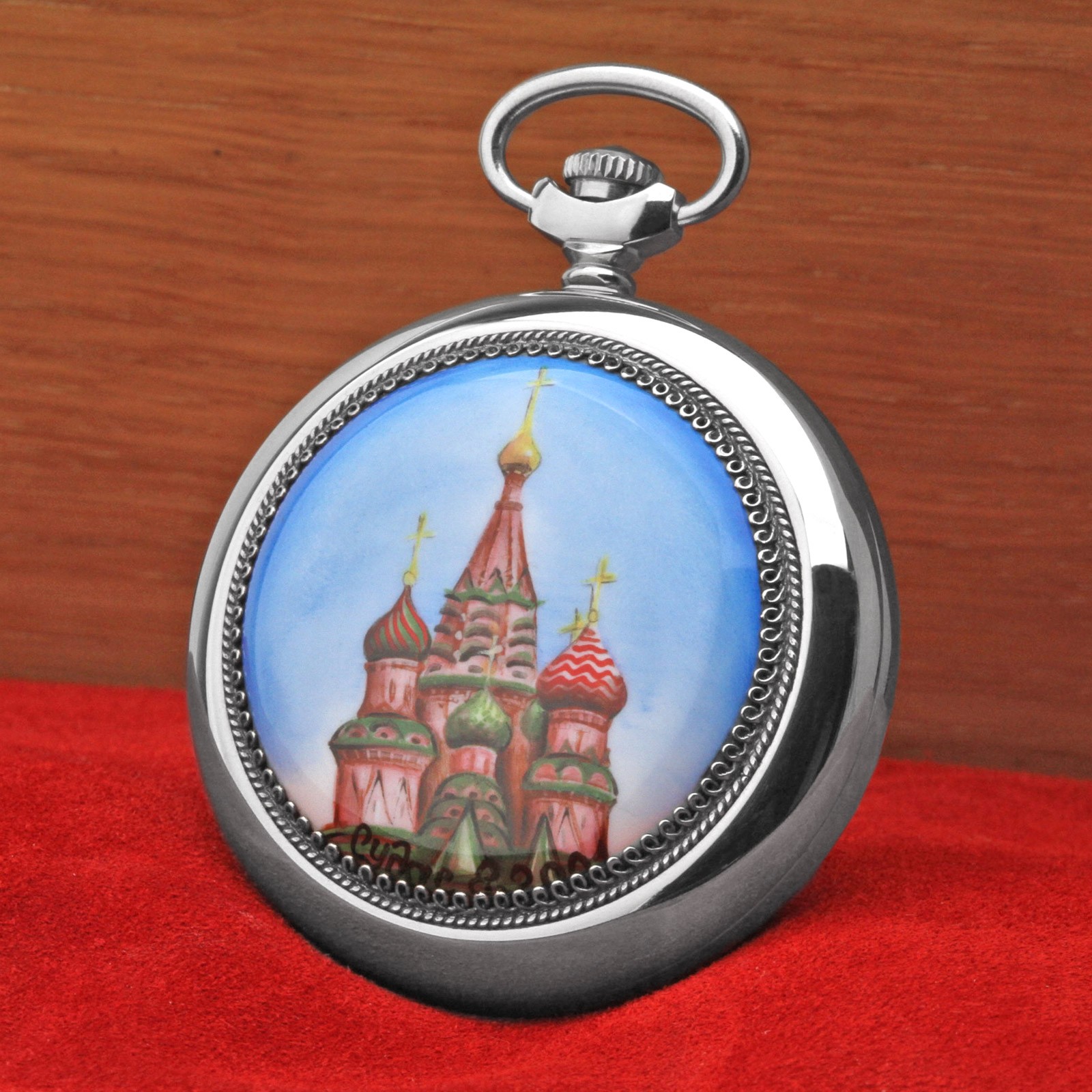 Diese Taschenuhr ist kein Massenprodukt und stammt aus einer kleinen Auflage von ca. 100 Stück. Sie werden dieses Modell in keinem Juweliergeschäft finden. Der Rückdeckel ist mit einer handbemalten und signierten Porzellanplatte versehen. Es ist ein Unikat und stellt ein besonderes Kunstwerk dar - es stellt die Bazilius Kathedrale auf dem Roten Platz in Moskau dar.
