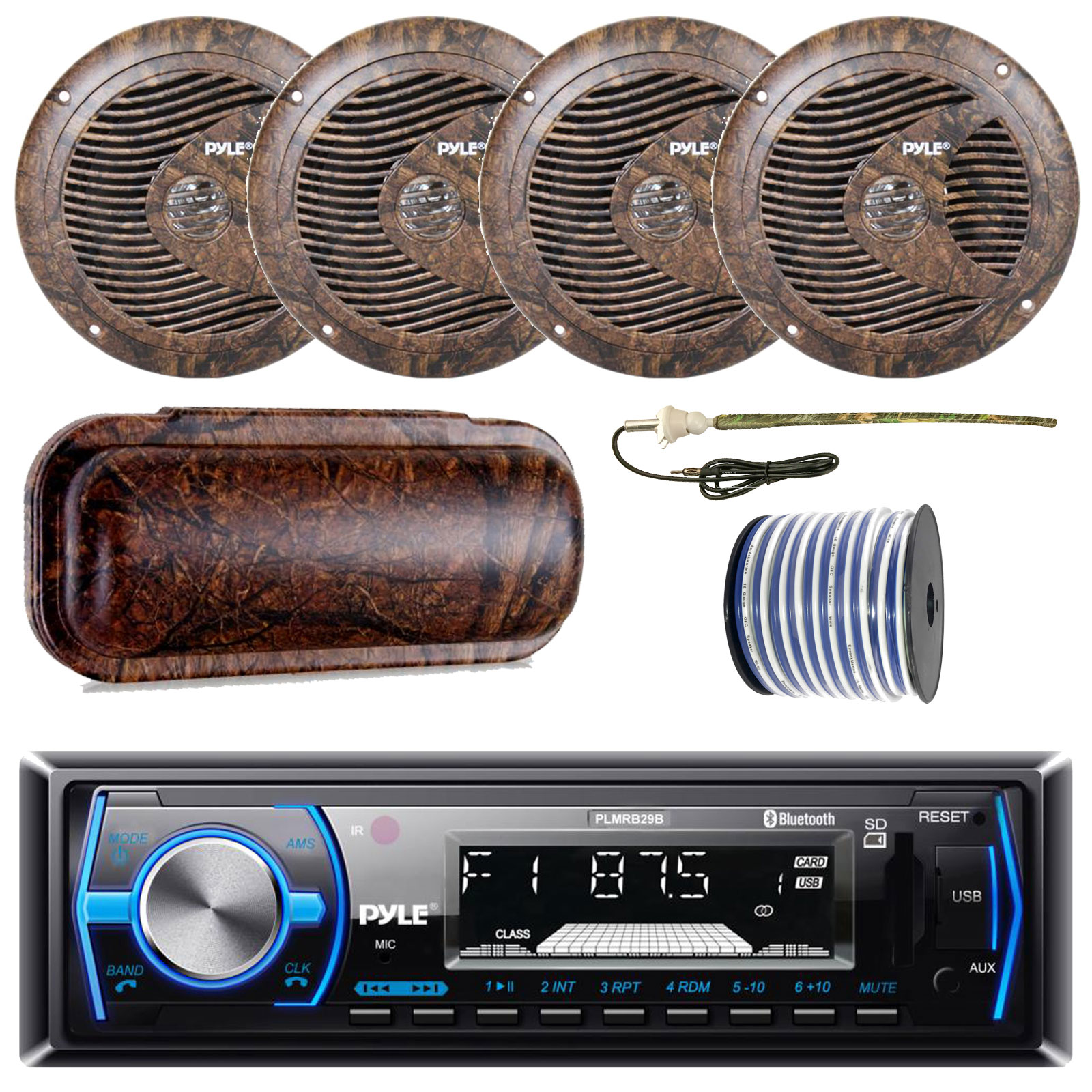 Pyle Marine Single-DIN Bluetooth MP3 USB AUX Black AM/FM Radio, 4x Pyle 6.5" Waterproof Camo 150 Watt Speakers, Stereo Shield Cover, Enrock Camouflage Boat Antenna, 18-G 50 Ft Wire