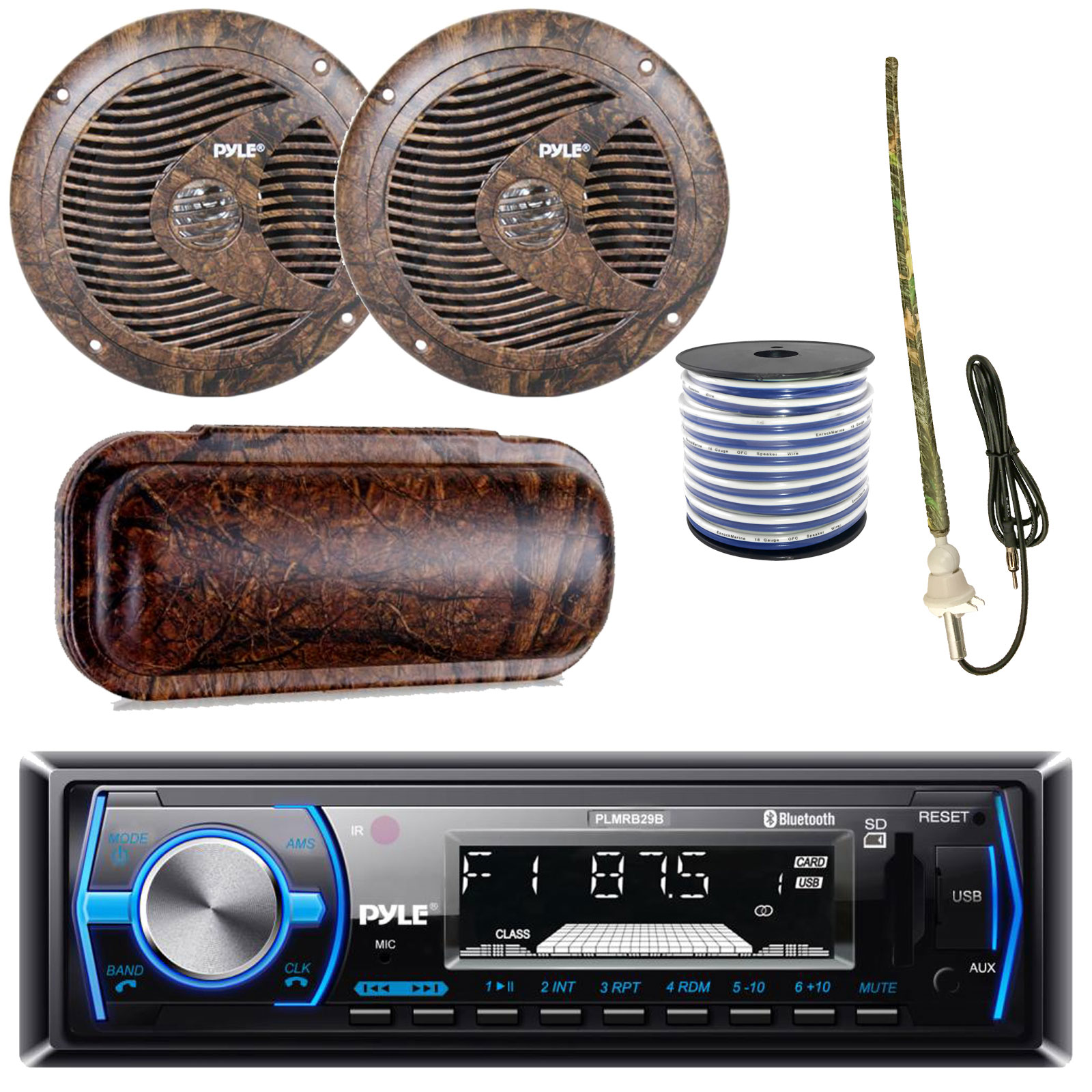 Pyle Marine Single-DIN Bluetooth MP3 USB AUX Black AM/FM Radio, 6.5" Waterproof Camo 150 Watt Speakers (Pair), Stereo Shield Cover, Enrock Camouflage Boat Antenna, 18-G 50 Ft Wire