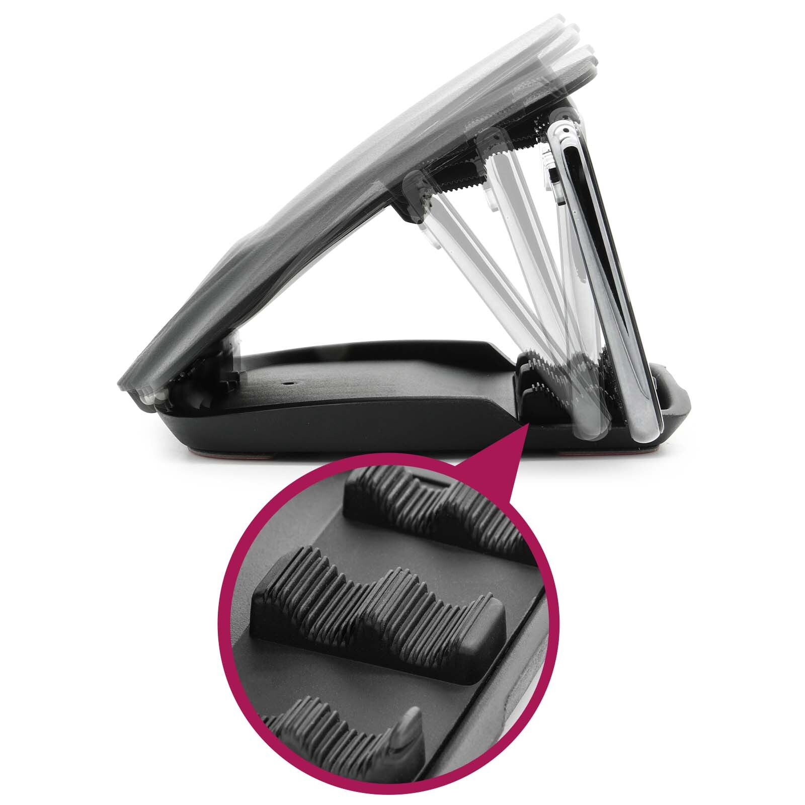 Sie besitzen zum Gerät einspannen 3 verschiedene, gummierte Einrast-Tiefen sodass Ihr Gerät immer optimal sichtbar bleibt.