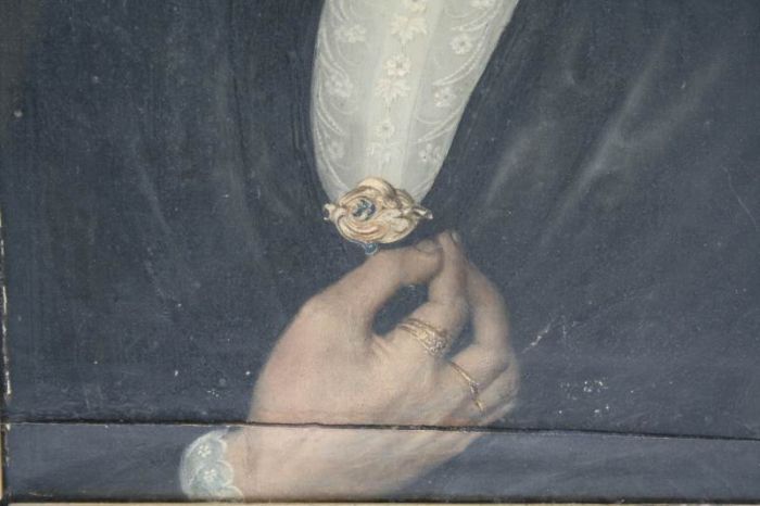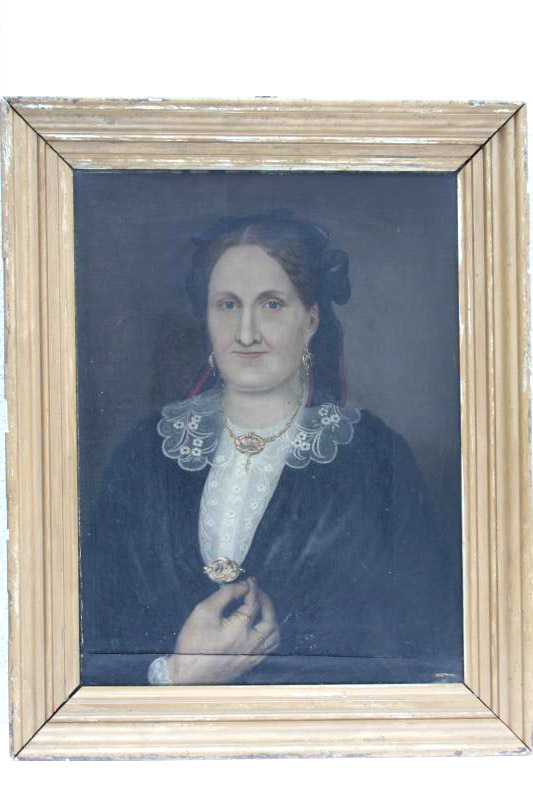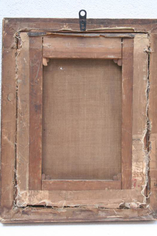 Der Rahmen ist bestossen und wurde mit Goldbronze ünerstrichen. Die Ecken müssen neu verleimt werden. Bei dem Gemälde hat sich die unten angesetzte Leinwand etwas gelöst und muß nachgeleimt werden, sonst gut erhalten.