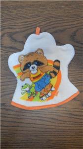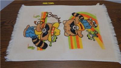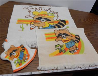 For your consideration is this pre-owned Vintage 3 Piece Britches the Raccoon Bath & Hand Towels & Mitt Set as follows: