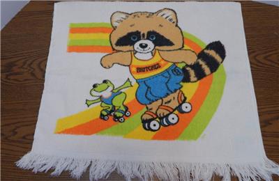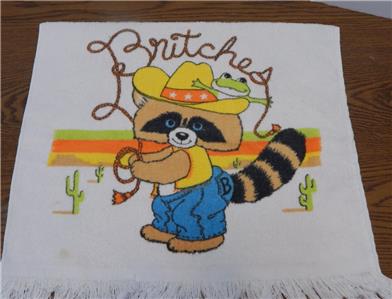 - Bath towel has view of Britches the Raccoon and frog friend roller skating on one end and Britches doing a rope trick that spells his name on the other end