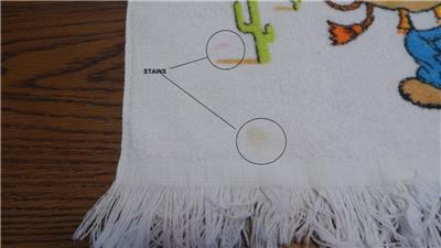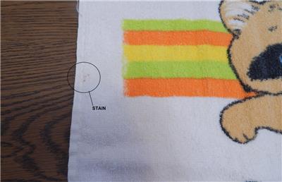 - FLAWED - These towels are freshly laundered, however, there appears to be some stains left behind; colors are vibrant; white background on the hand towel is discolored; no rips, tears, repairs, or other signs of abuse