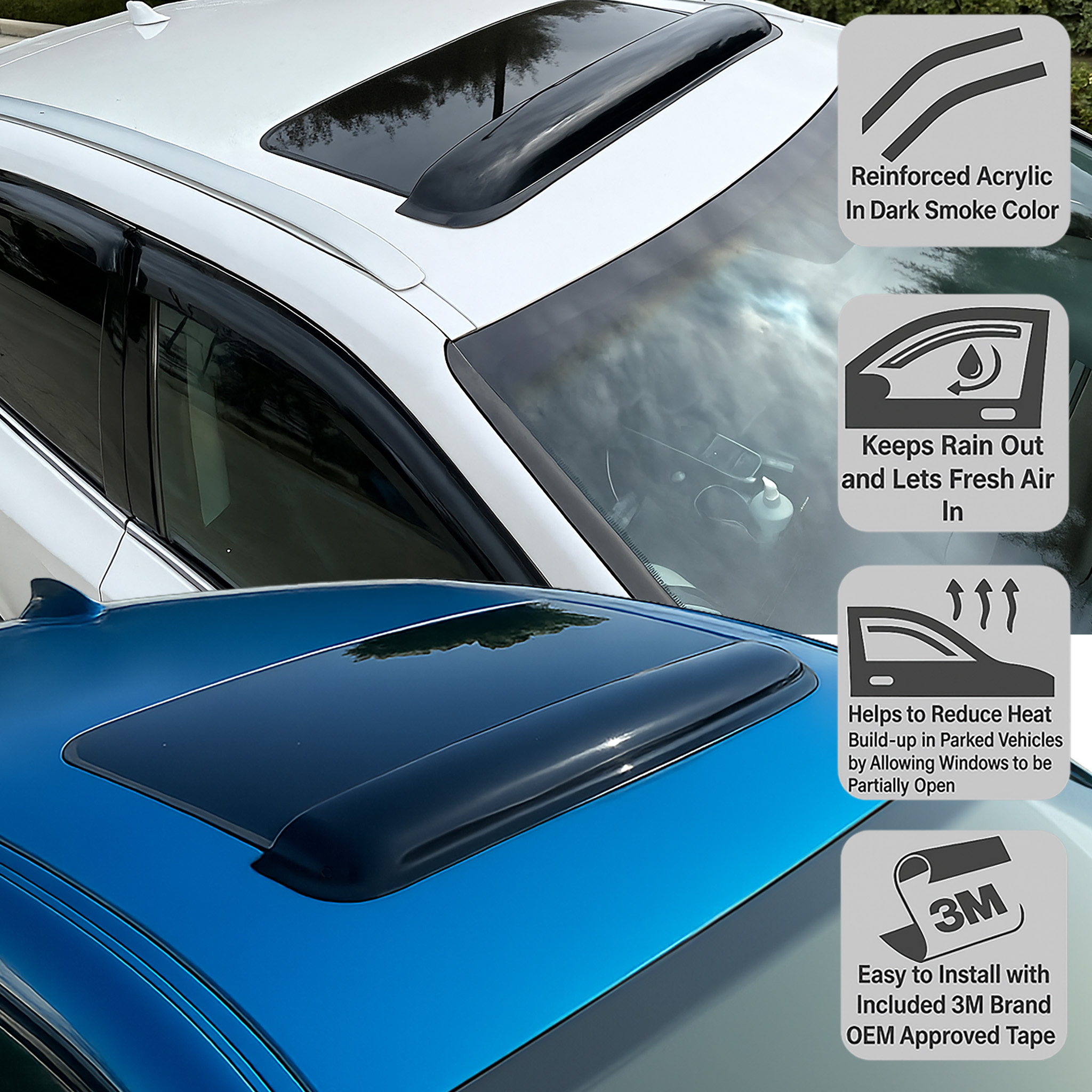 This listing includes a vehicle-specific window visor and sunroof visor combination set designed to improve comfort and ventilation while driving or parking. The dark smoke finish helps reduce interior heat buildup and allows fresh air circulation while keeping rain out when windows or the sunroof are slightly open.