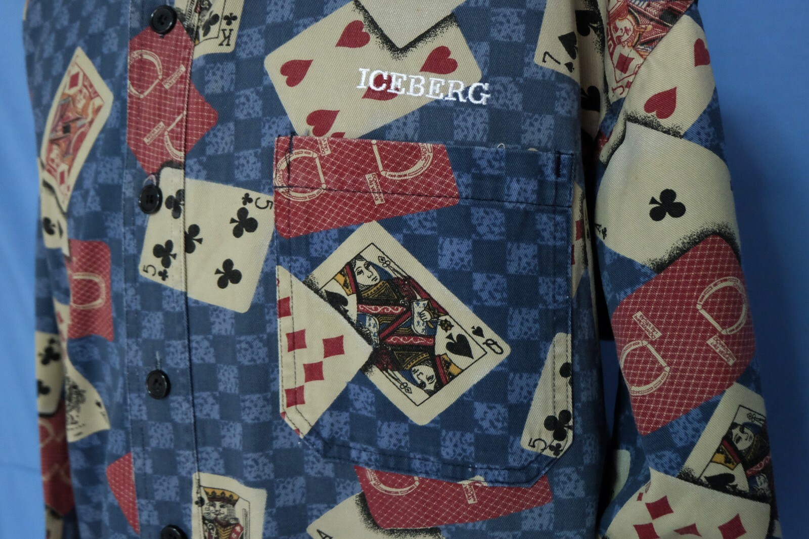 Awesome vintage 90's ICEBERG Jeans blue check & card print men's casual shirt long sleeves with buttons front authenticity guaranteed. The shirt has point collar, single chest pocket on left, embroidered logo above pocket. 7 buttons closure on front. The color is blue with check pattern and card printed on shirt. Fabric is heavyweight 100% cotton twill. The shirt is pre-owned still in good condition, the shirt has faint stains on right cuff please see photos. It has been laundered clean and fresh ready to wear. Don't miss out cool and awesome shirt.