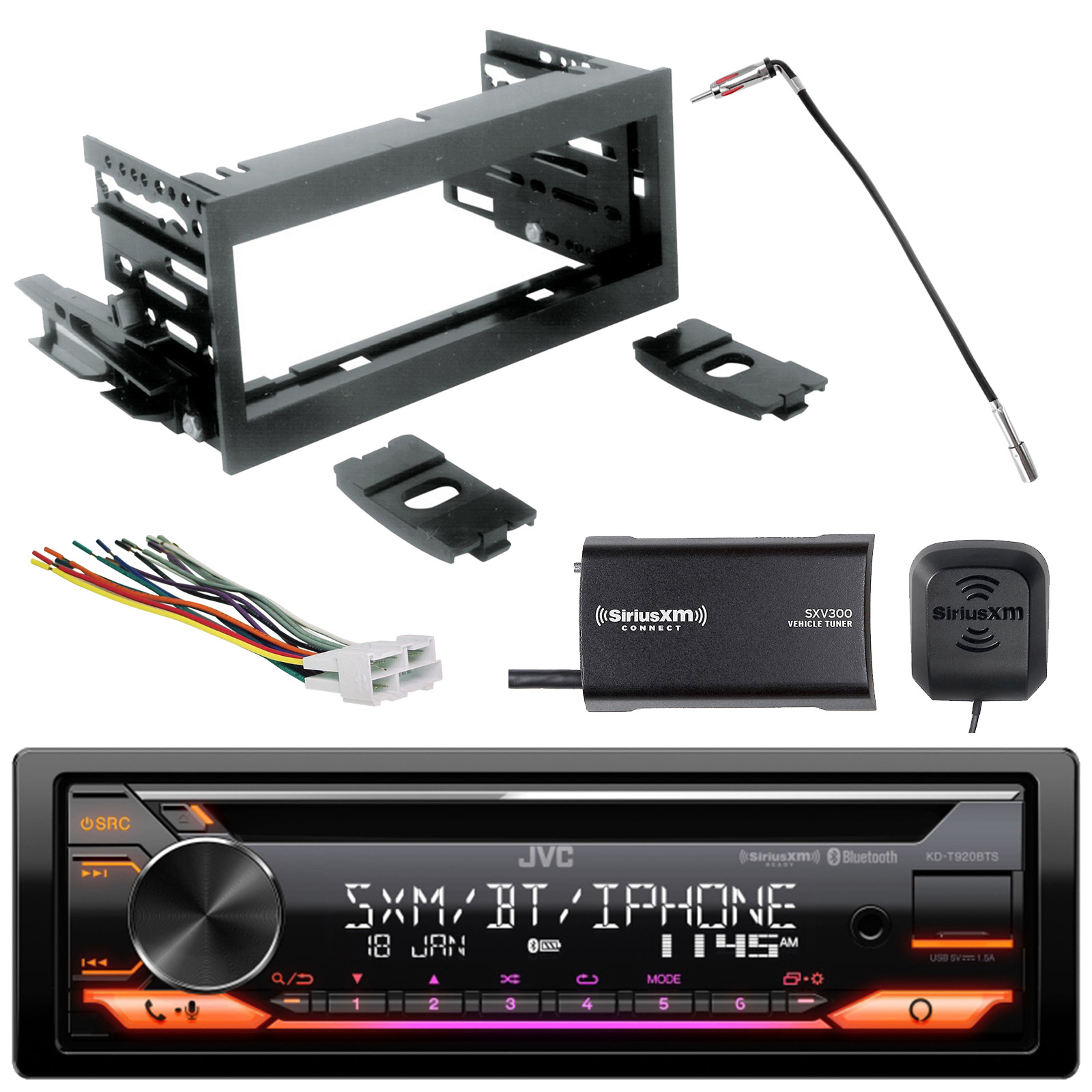 JVC KD-T920BTS Single DIN Bluetooth AM/FM Radio CD Stereo Car Audio Receiver, Satellite Radio XM Tuner, Radio Wiring Harness, Antenna Adapter, Dash Install Kit for 95-02 GM Full Size Truck / SUV / Van