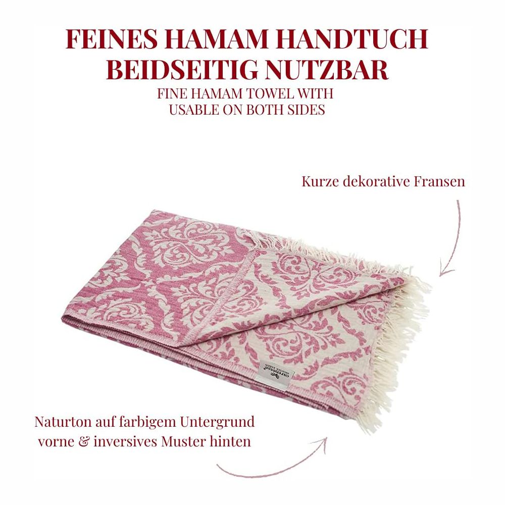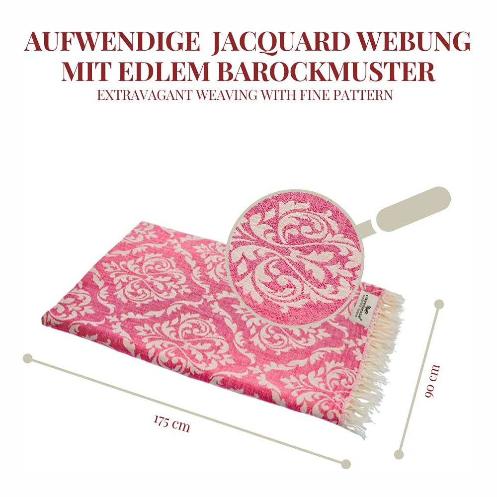 HOCHWERTIG & SCHÖN: Aufwändig als doppelseitiger Jacquard gewebt, gewinnt das hauchzarte Gewebe wolkenweiches, feines Volumen. Das fein ziselierte Barock-Ornament erscheint so auf der einen Seite im Naturton auf farbigem Fond, auf der anderen Seite umgekehrt. Ein Effekt, der das Hamamtuch "BAROCK" von bedruckten Tüchern aller Art deutlich unterscheidet.