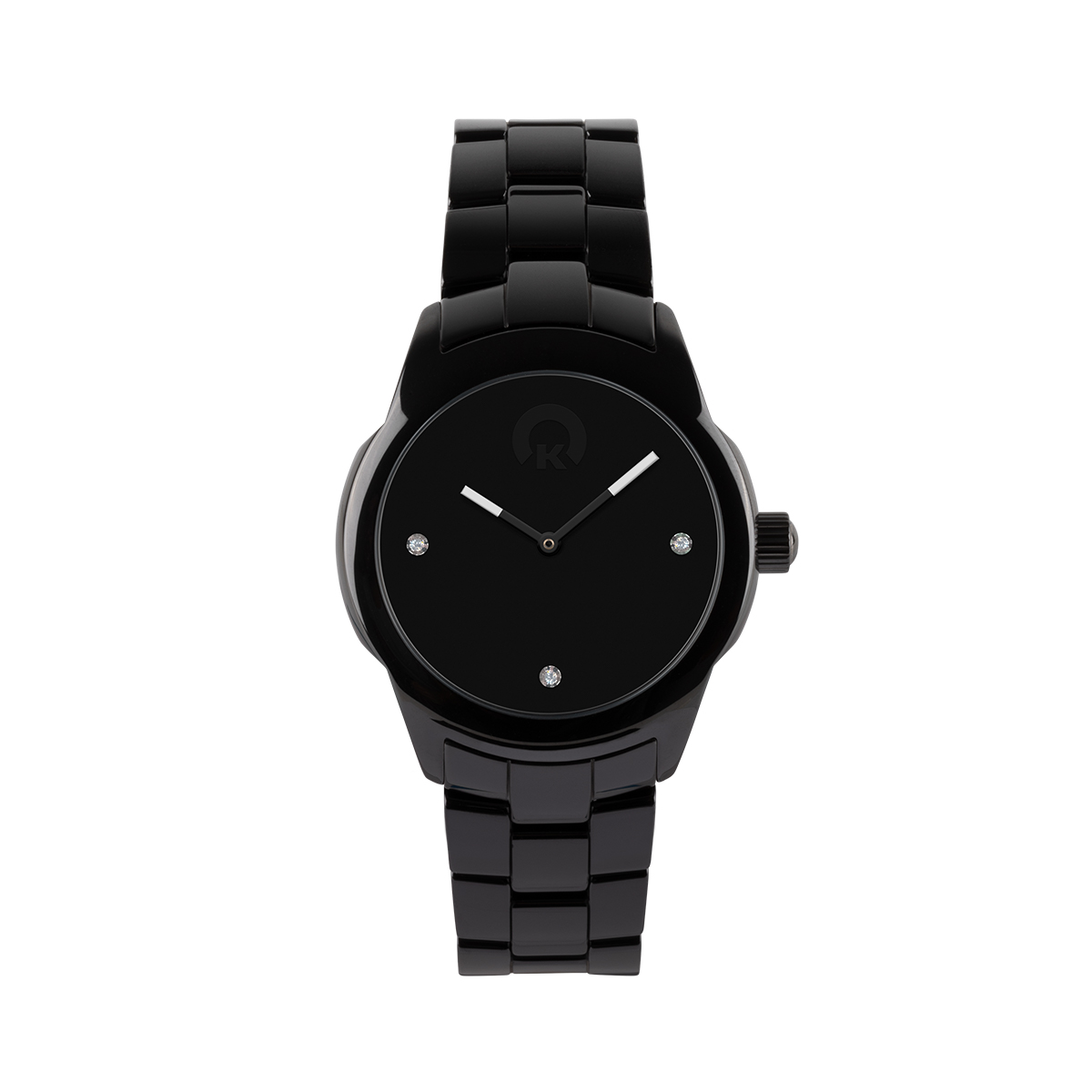 Puristisches Design – die Full Moon Variante für den Black&White-Style und abendliche Eleganz: Gehäuse, Krone und Armband in schwarzer Keramik, Ziffernblatt mit Kraftworxs Logo und funkelnden Kristallen in Schwarz, Zeiger in Weiß.