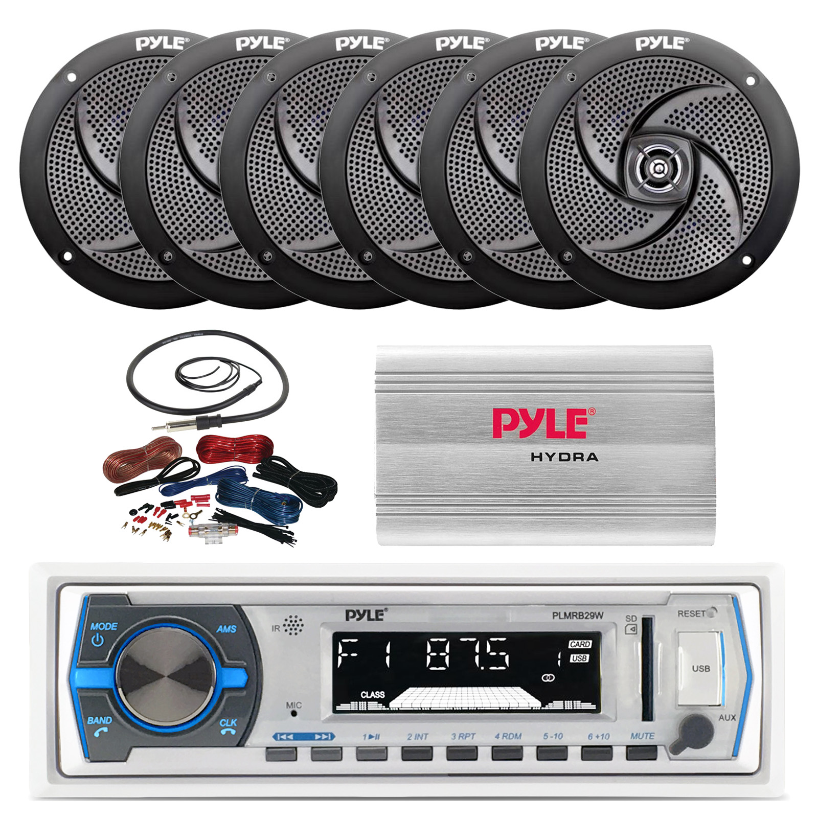 Pyle PLMRB29W Single DIN Bluetooth Marine MP3 Stereo Receiver, 6x 6.5'' 100 Watt Max 2-Way Slim Low Profile Waterproof Audio Speakers (Black), 4-Channel Amplifier w/Wiring Install Kit, 22" Antenna