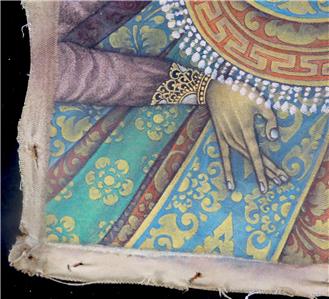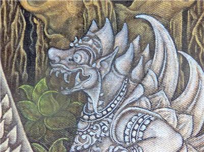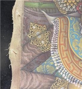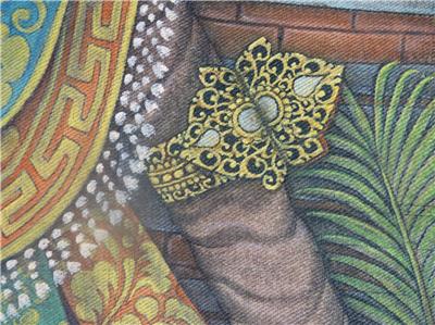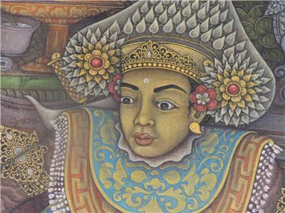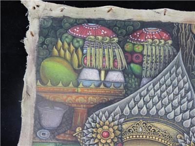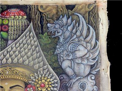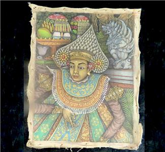 A good vintage traditional Balinese watercolour on fabric depicting an interior scene with figure in elaborate headdress before various objects.